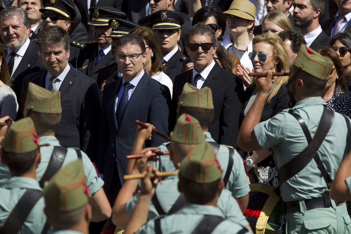 El director general de la Policía Nacional, Ignacio Cosidó (2i), y el actor Antonio Banderas (2d), ente los congregados para ver como los legionarios portan la imagen del Cristo de la Buena Muerte.