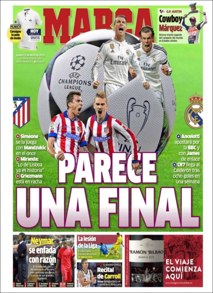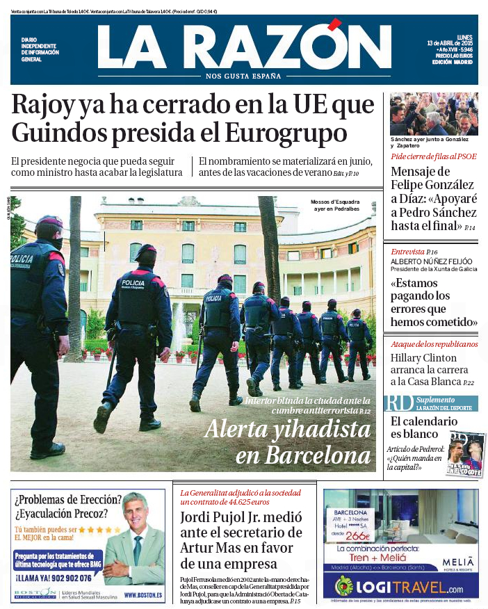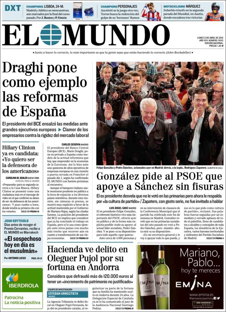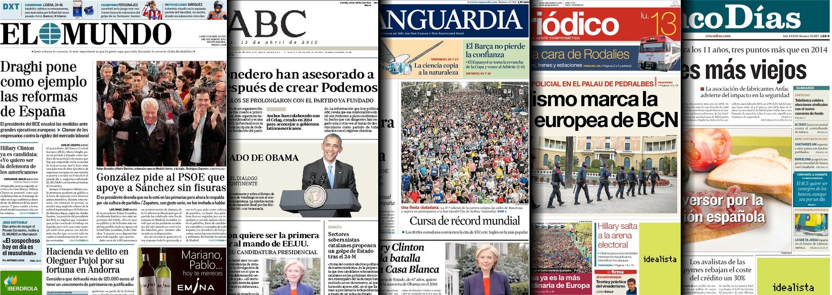 Portadas de los diarios El Mundo, El País, ABC, La Razón, La Vanguardia, El Periódico, Cinco Días, El Economista, Marca, As, Mundo Deportivo y Sport.