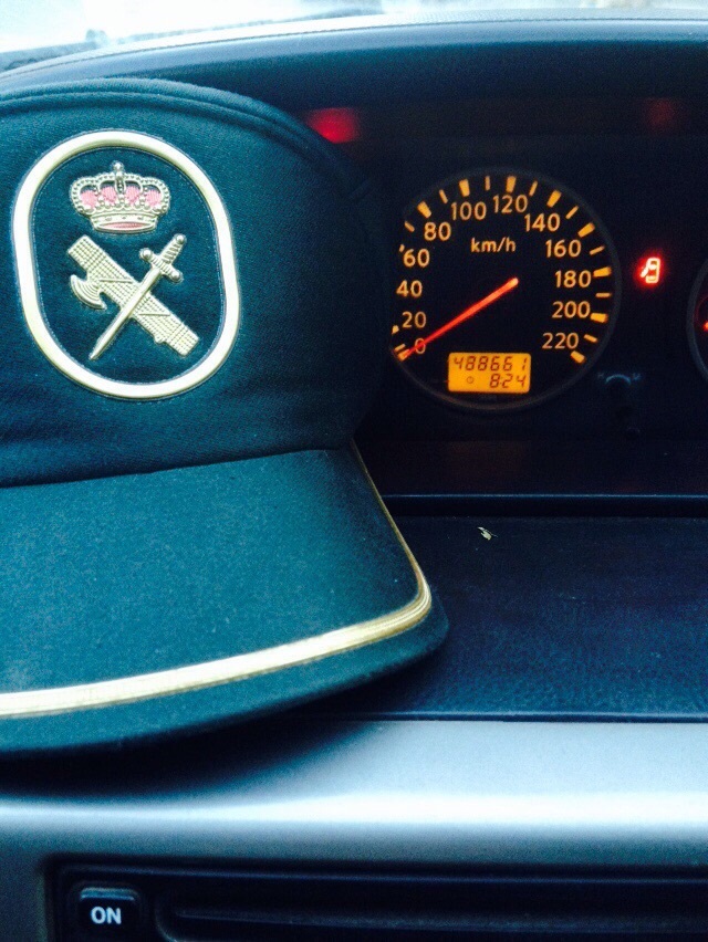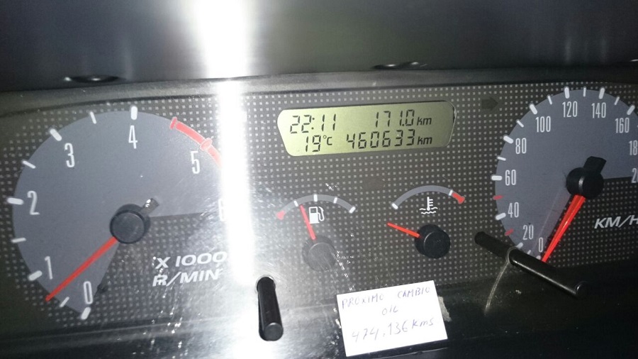 Vehículo patrulla con 460633 kilómetros. Un papel pegado con celo recuerda que hay que cambiar el aceite a los 474136 kilómetros.