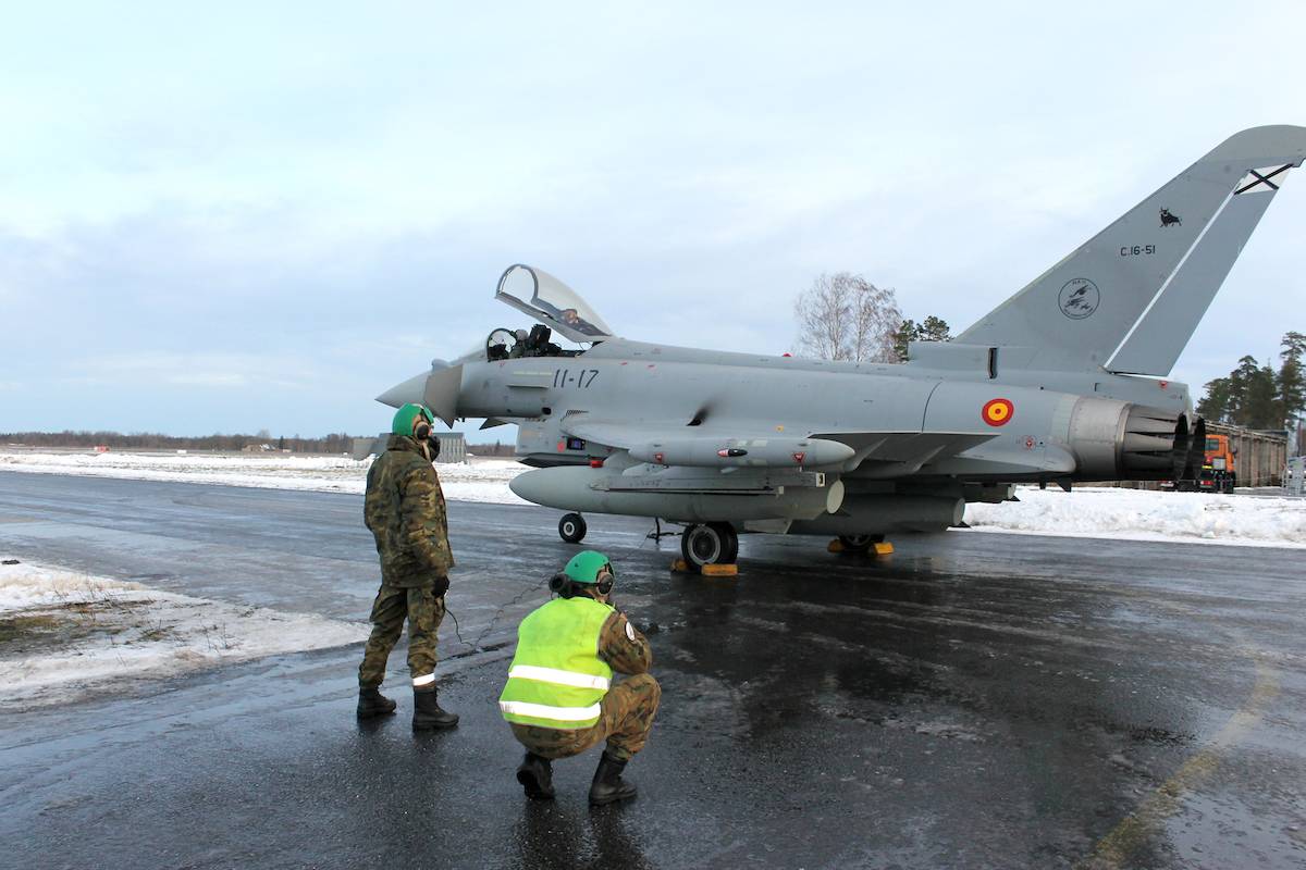 Personal del Ejército del Aire prepara al Eurofighter para un nuevo vuelo en la base aérea de Ämari, en Estonia