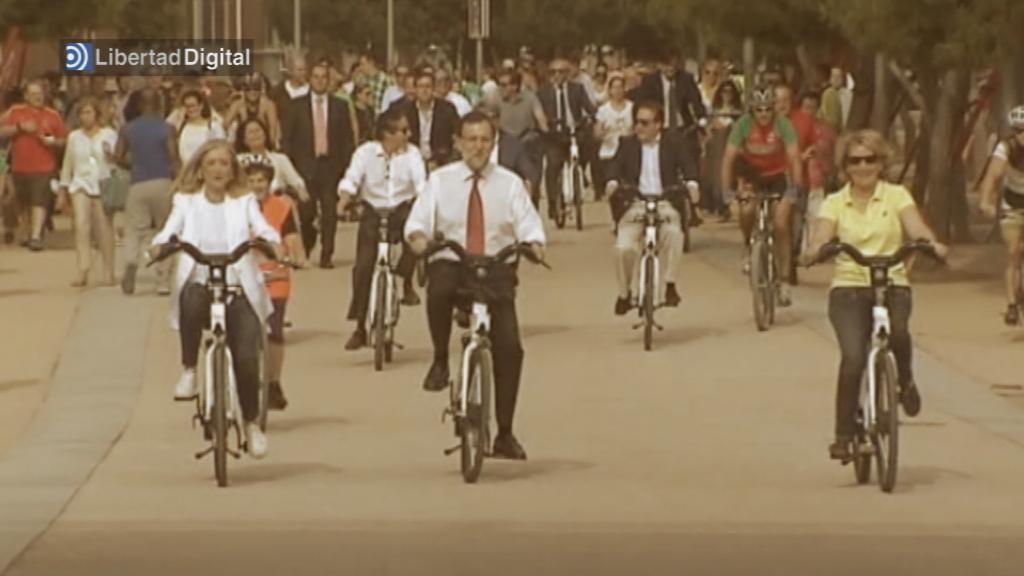 Mariano Rajoy ha protagonizado una fotografía poco habitual, se ha montado en una bicicleta en Madrid Río para arropar a Aguirre y Cifuentes al más puro estilo de 'Verano Azul'