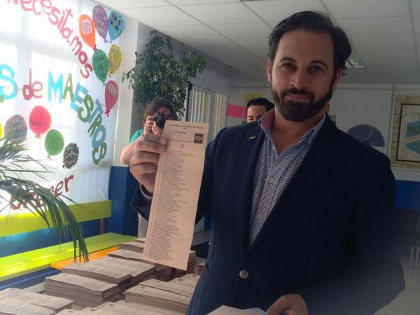 Santiago Abascal, candidato de Vox para la Comunidad de Madrid, acudía a votar mostrando la papeleta de su partido.