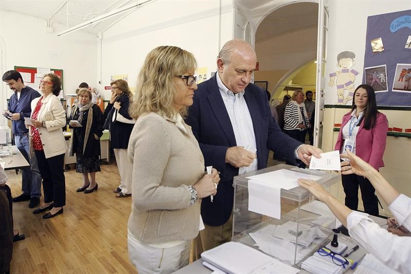 El ministro del Interior, Jorge Fernández Díaz, junto a su esposa Asunción Carcoba Garitaonaindía, ha votado en un colegio electoral de Barcelona.
