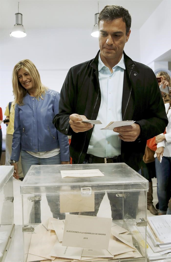 El secretario general del PSOE, Pedro Sánchez, acompañado de su esposa vota en el Centro Cultural Volturno, en Pozuelo de Alarcón.