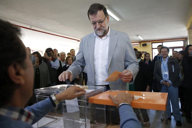 El presidente del Gobierno, Mariano Rajoy, deposita su voto para las elecciones del 24M, esta mañana en el colegio elecotral Bernardette de Aravaca