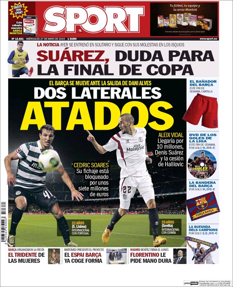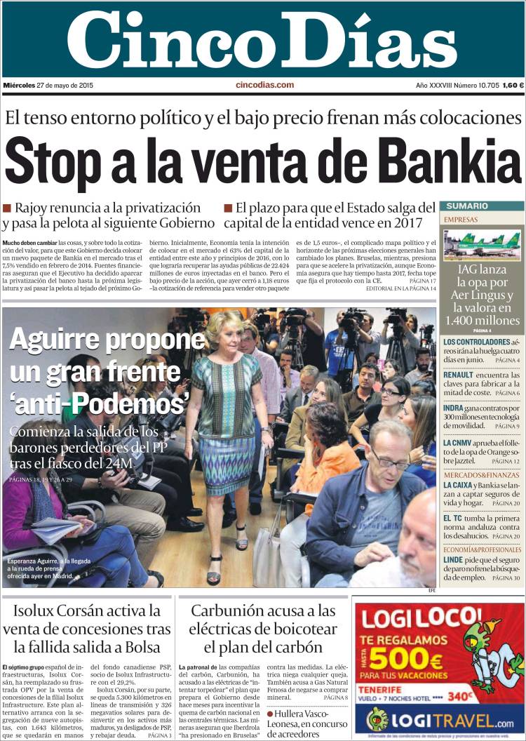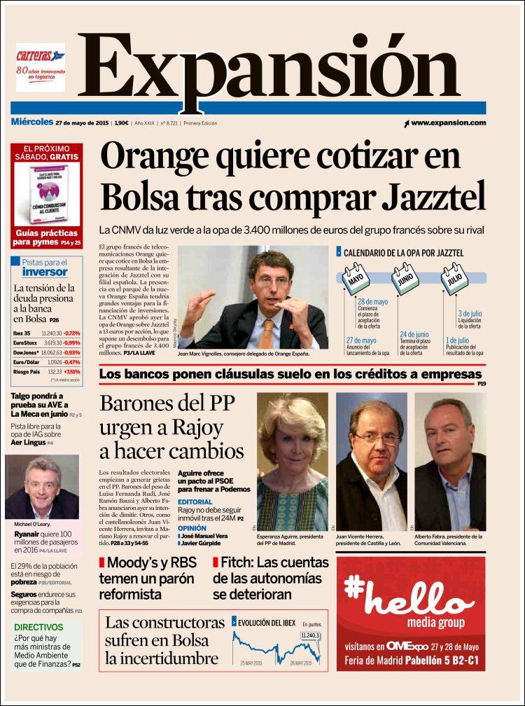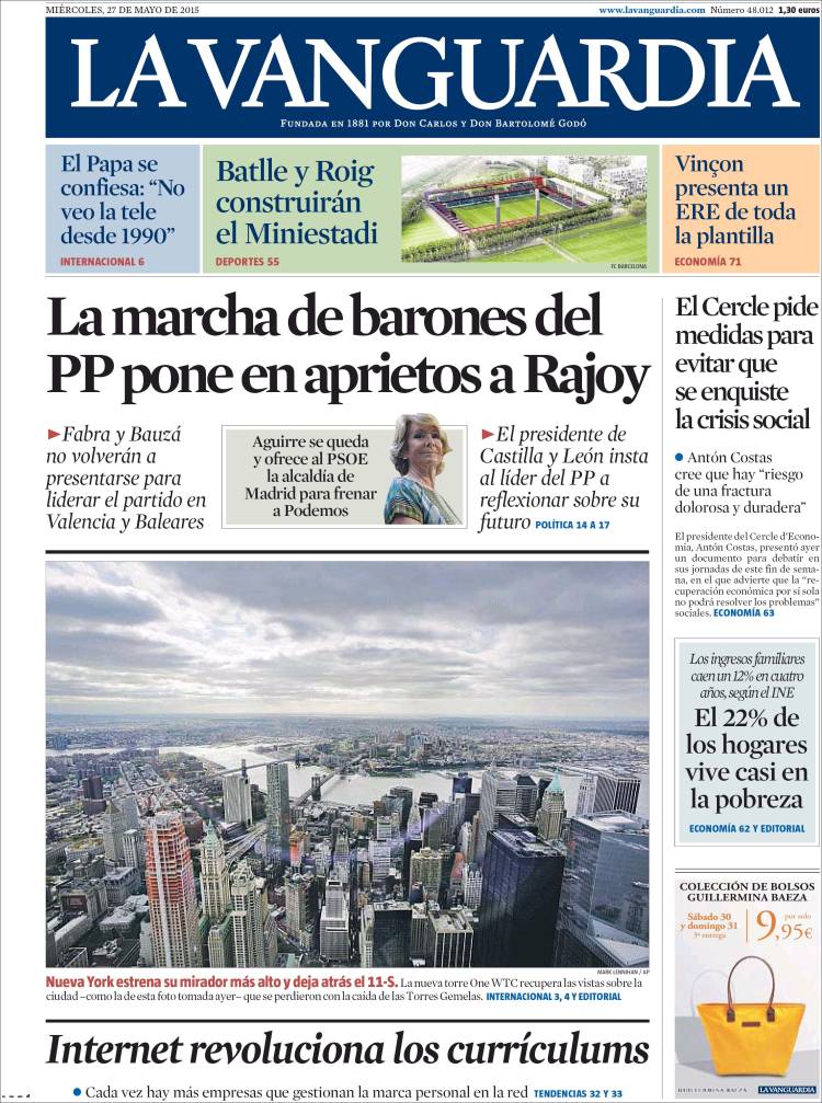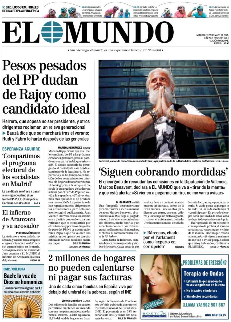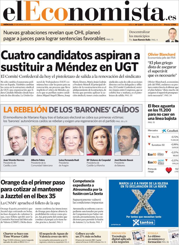 Portadas de los diarios El Mundo, El País, ABC, La Razón, La Vanguardia, El Periódico, Cinco Días, El Economista, Expansión, Marca, As, Mundo Deportivo y Sport.