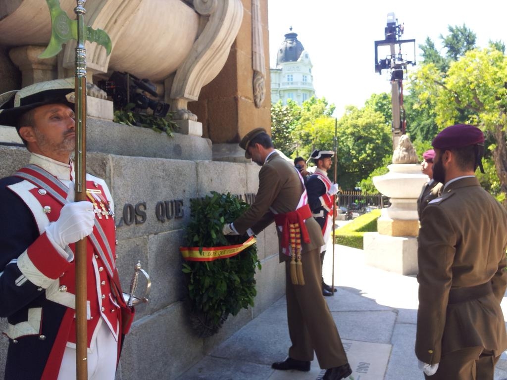 Felipe VI coloca una corona de laurel en el monumento a los caídos.