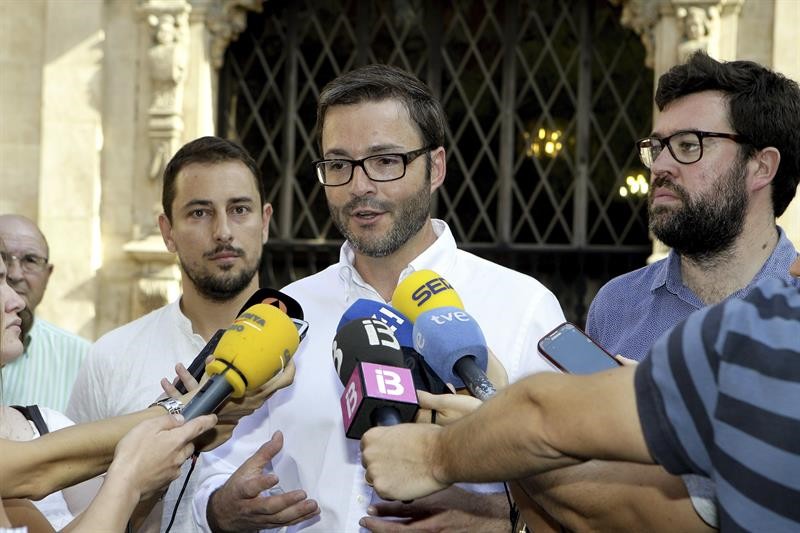 Palma de Mallorca (399.000). José Hila, del PSOE, en el centro de la imagen, junto a los candidato a por las formaciones políticas Son Palma, Miquel Comas, y MÈS, Antoni Nogeras (d). PSOE y MÈS se intercambiarán la alcaldía cada dos años.