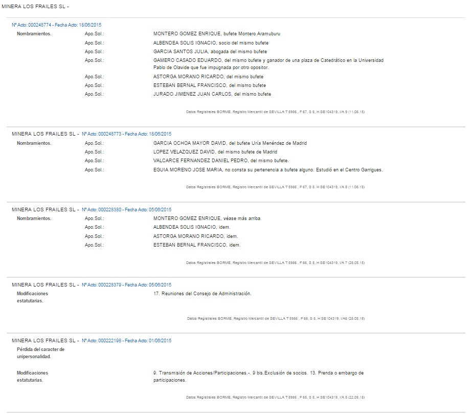 Es más, es que desde la publicación del trabajo de Libertad Digital, la situación registral de la sociedad Minera los Frailes es absolutamente diferente habiéndose ampliado el capital hasta un millón de euros tras haber obtenido la concesión y curiosamente han aparecido nuevos socios y administradores.