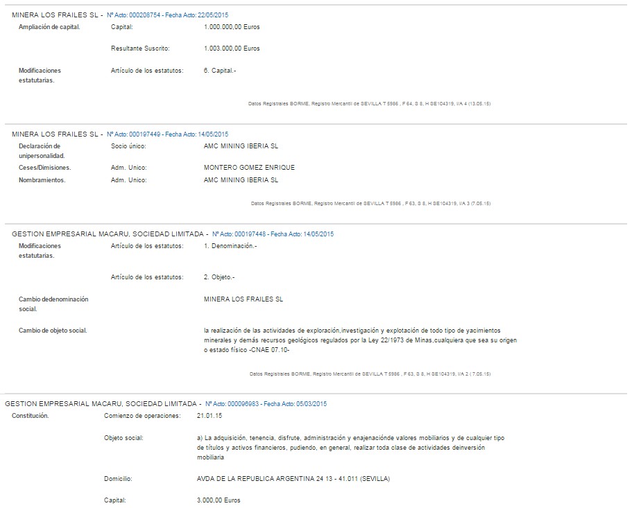 Extrañamente, la sociedad Minera Los Frailes se constituyó el pasado 21 de enero de este mismo año y tiene un capital social de 3.000 euros, algo extraño para una operación de 300 millones de euros de envergadura. La sociedad, anteriormente denominada Gestión Empresarial Macaru, SL, tiene por objeto social la realización de las actividades de exploración, investigación y explotación de todo tipo de yacimientos minerales y demás recursos geológicos.