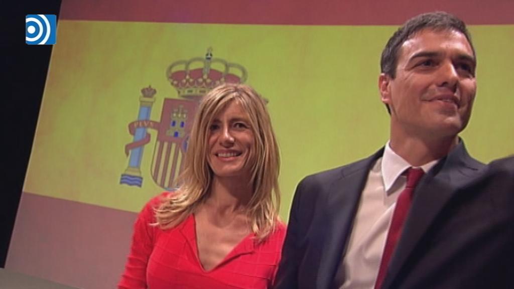 Pedro Sánchez ha presentado su candidatura a las elecciones generales flanqueado por una gran bandera de España y por su mujer, Begoña Gómez, que iba vestida de rojo a juego con su corbata.