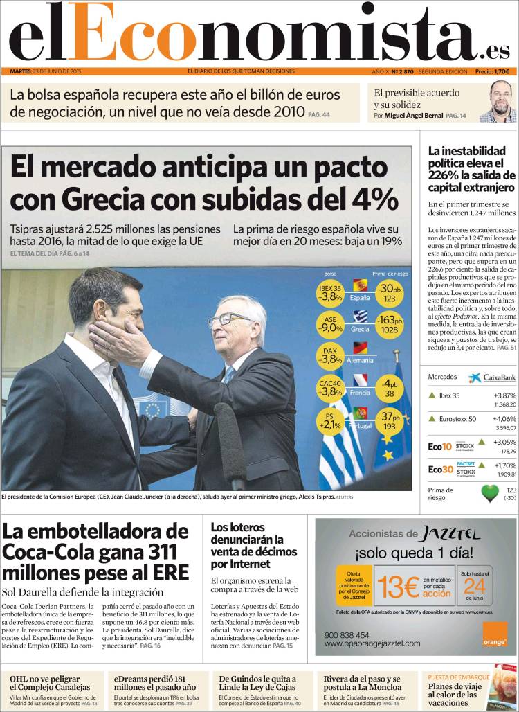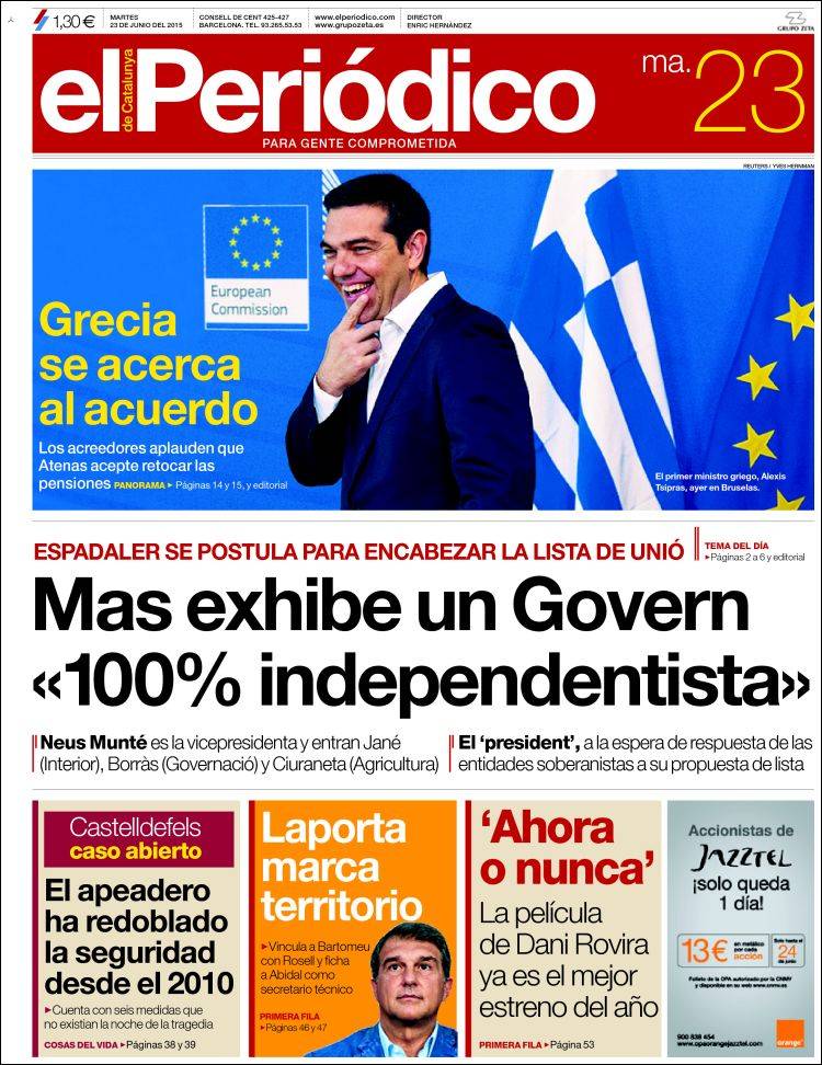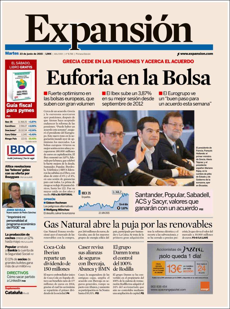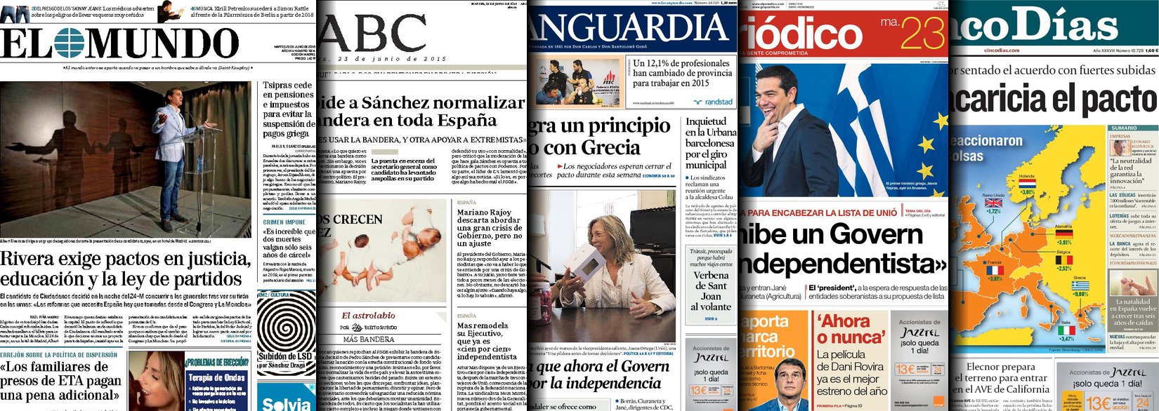 Portadas de los diarios El Mundo, El País, ABC, La Razón, La Vanguardia, El Periódico, Cinco Días, El Economista, Expansión, Marca, As, Mundo Deportivo y Sport.