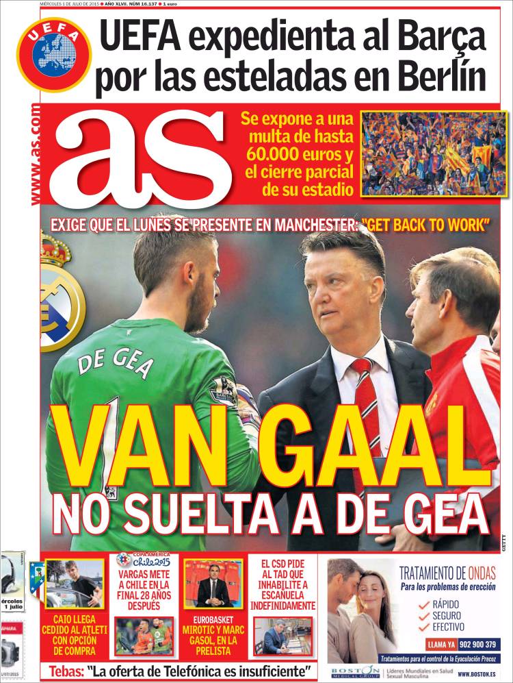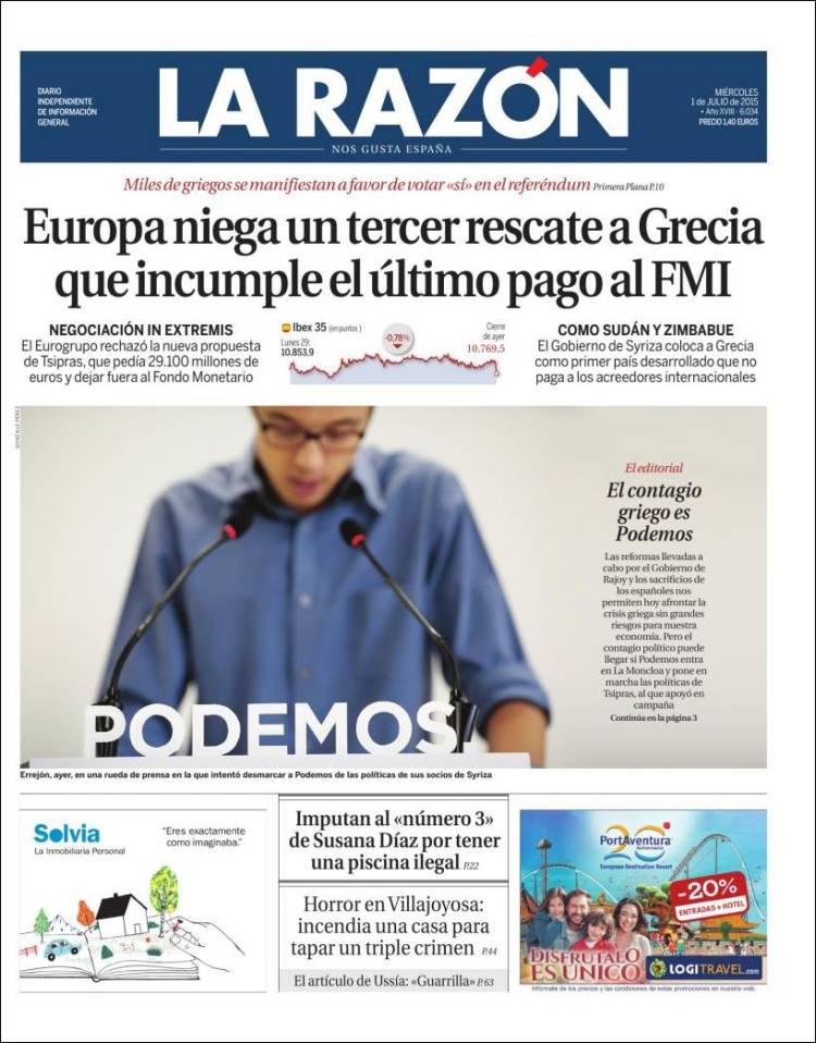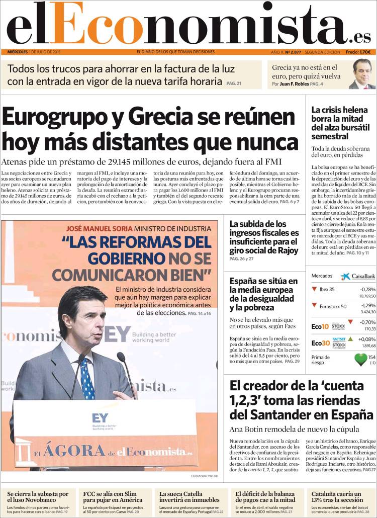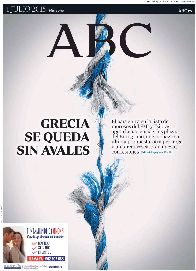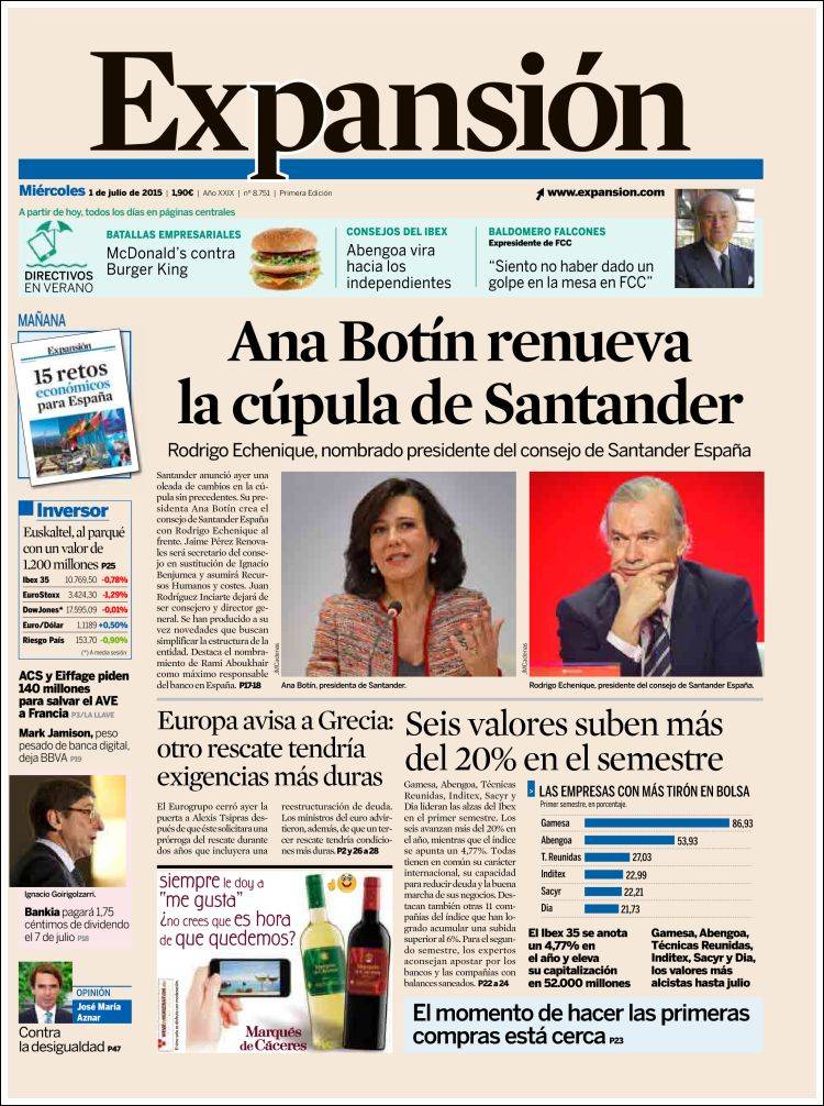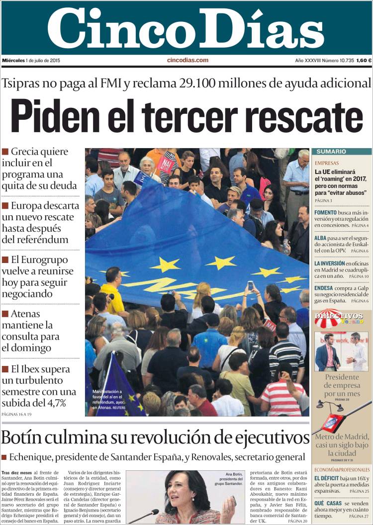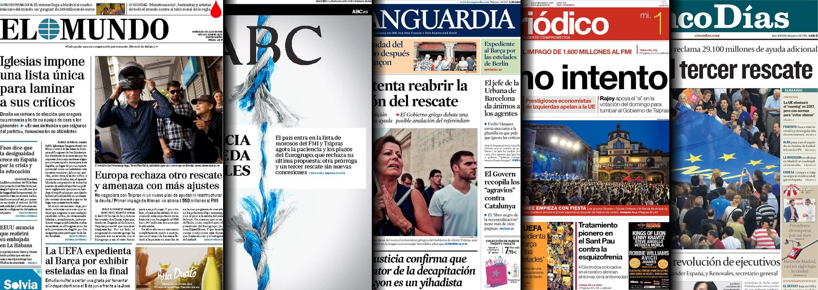Portadas de los diarios El Mundo, El País, ABC, La Razón, La Vanguardia, El Periódico, Cinco Días, El Economista, Expansión, Marca, As, Mundo Deportivo y Sport.Portadas de los diarios ABC, As, Cinco Días, El Periódico y La Vanguardia.