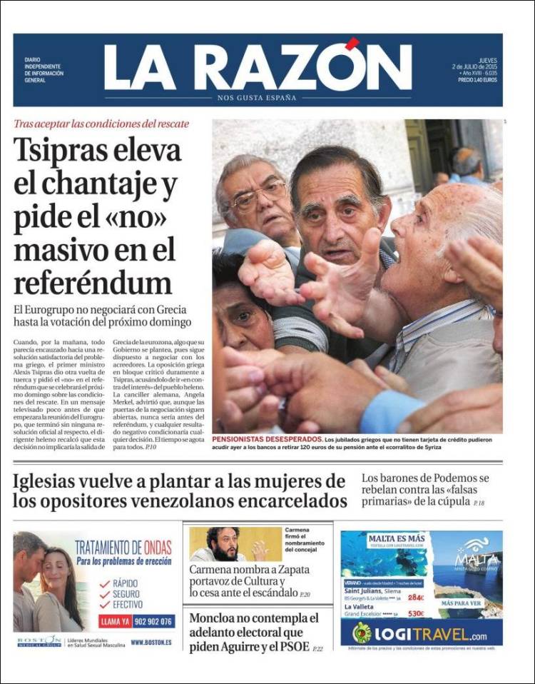 "Tsipras eleva el chantaje y pide el 'no' masivo en el referéndum"