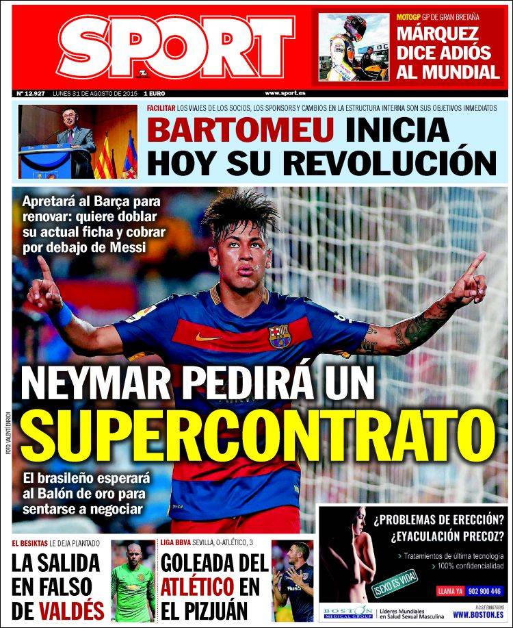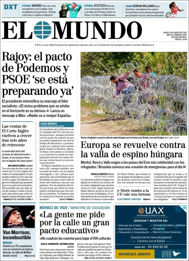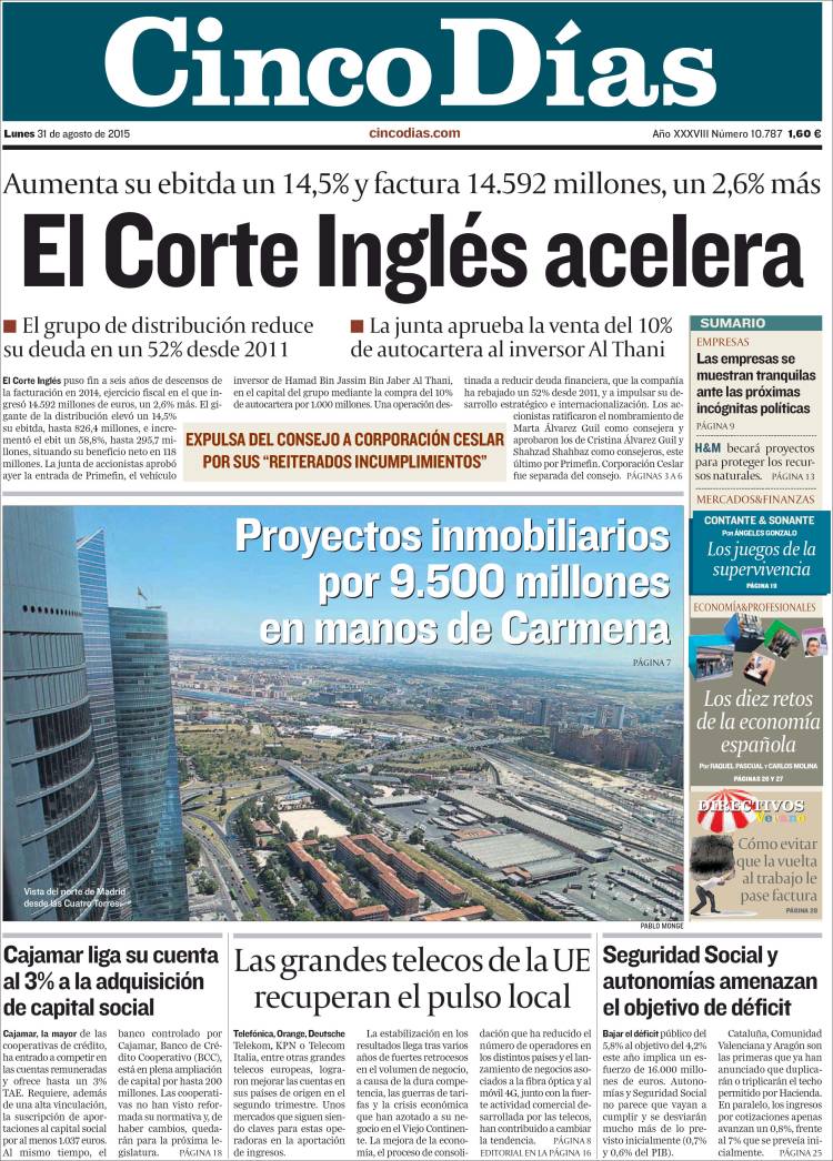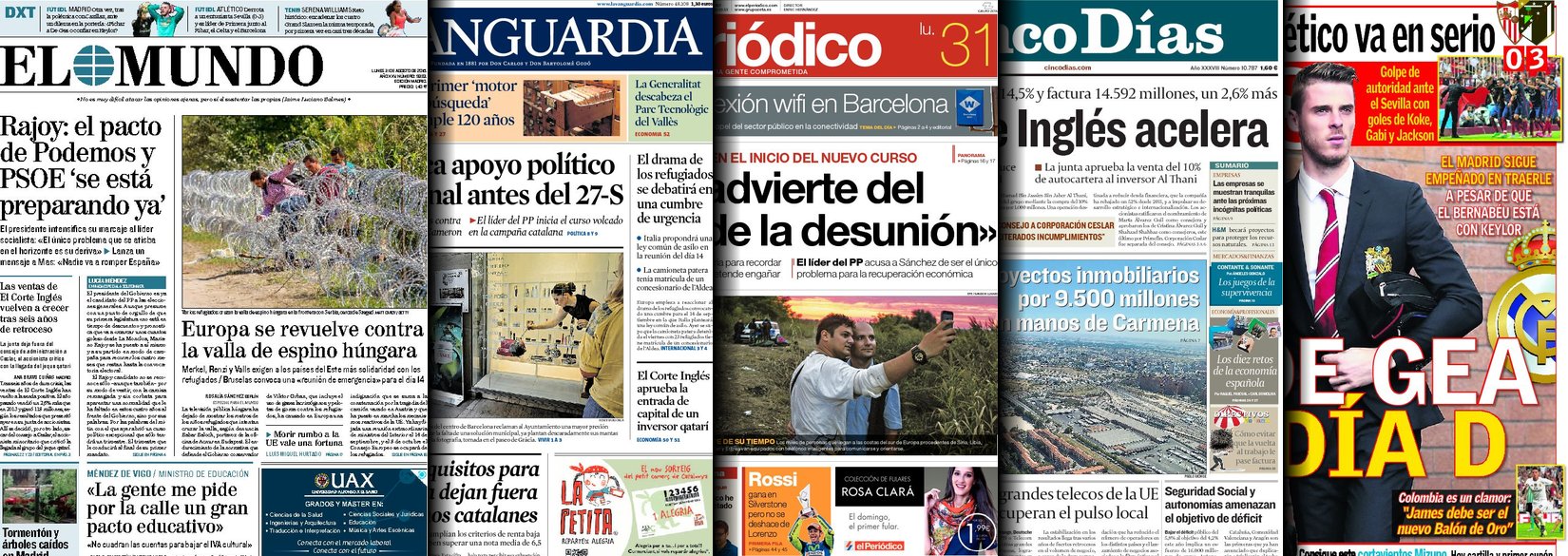 Portadas de los diarios El Mundo, El País, ABC, La Razón, La Vanguardia, El Periódico, Cinco Días, El Economista, Expansión, Marca, As, Mundo Deportivo y Sport.