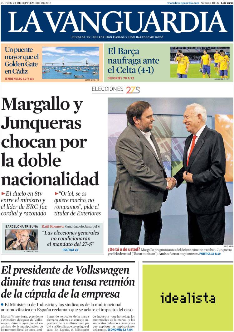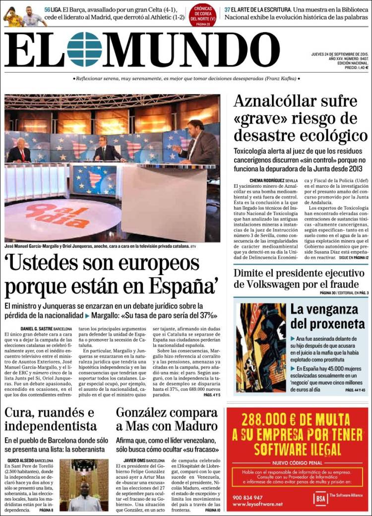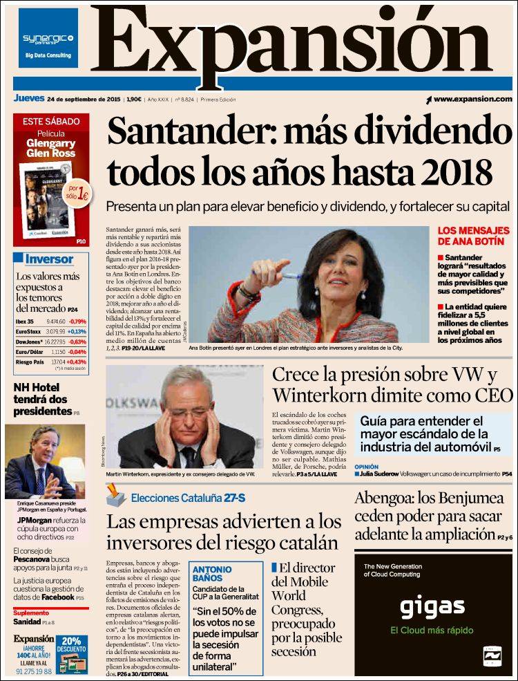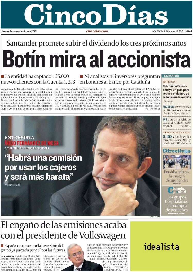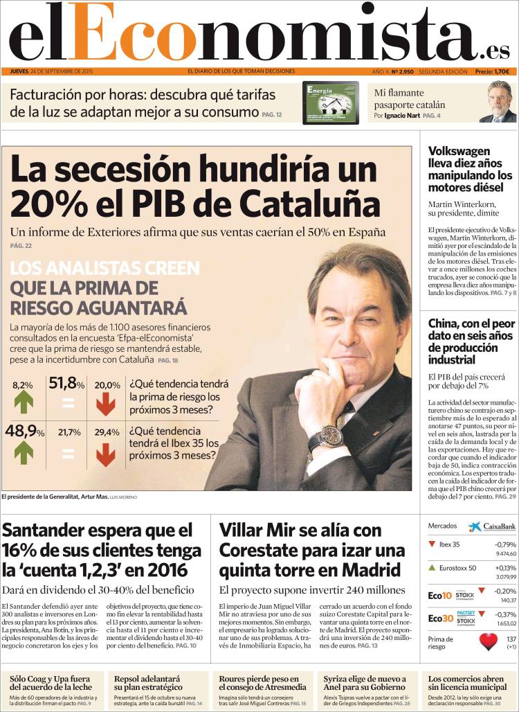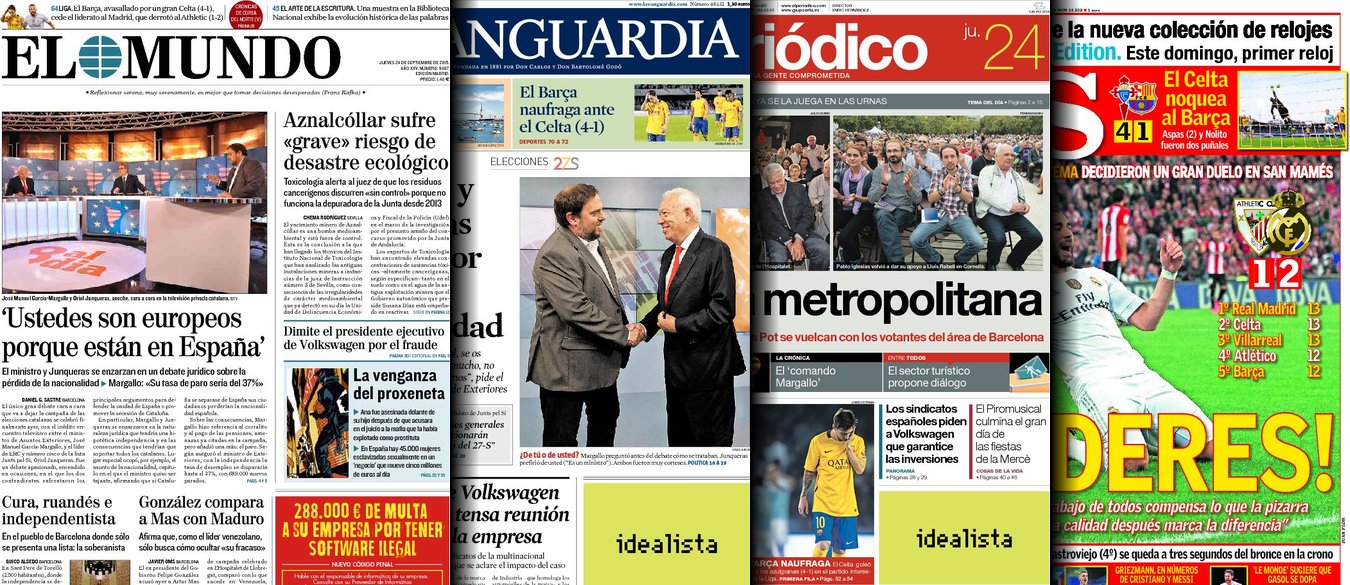 Portadas de los diarios El Mundo, El País, ABC, La Razón, La Vanguardia, El Periódico, Cinco Días, El Economista, Expansión, As y Sport.
