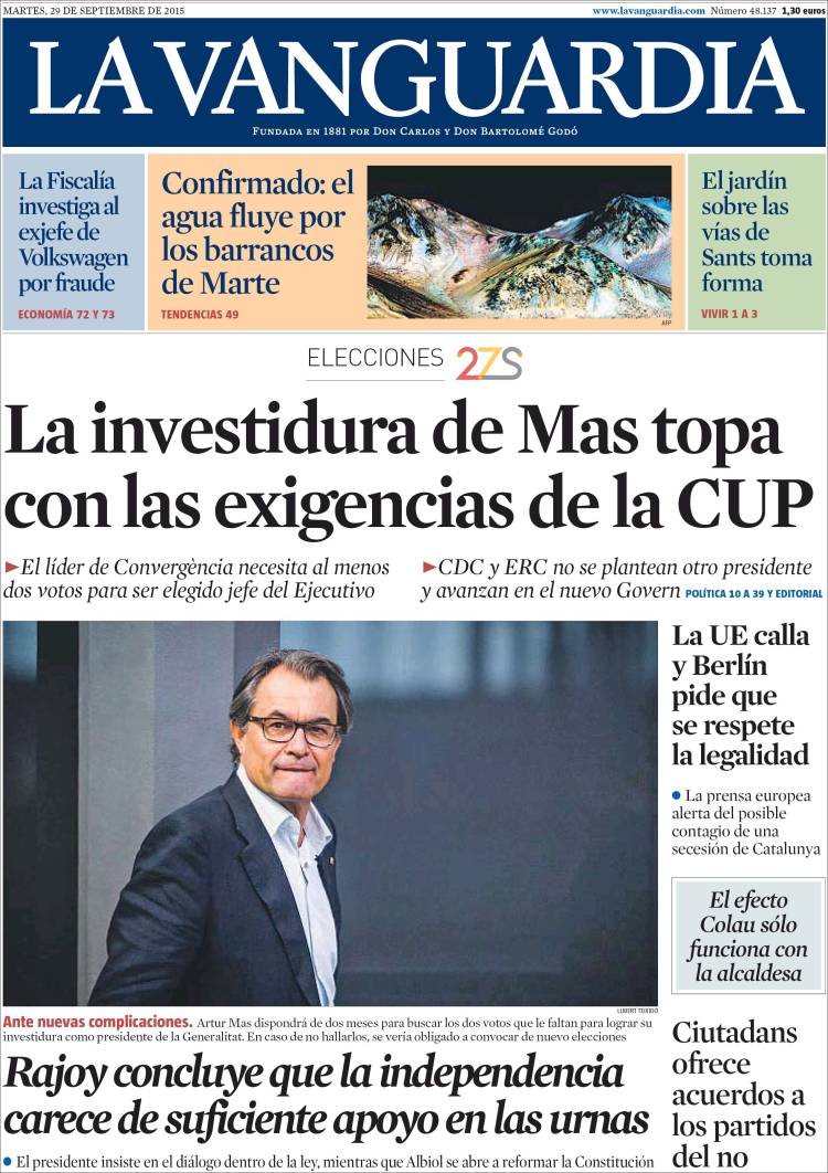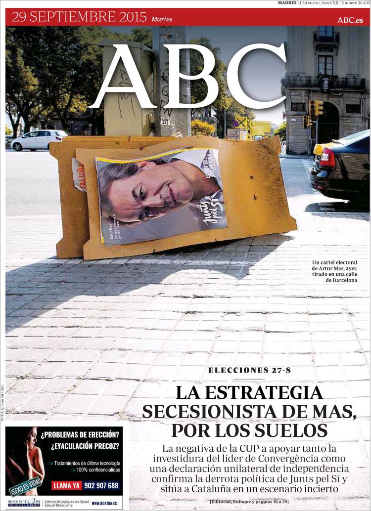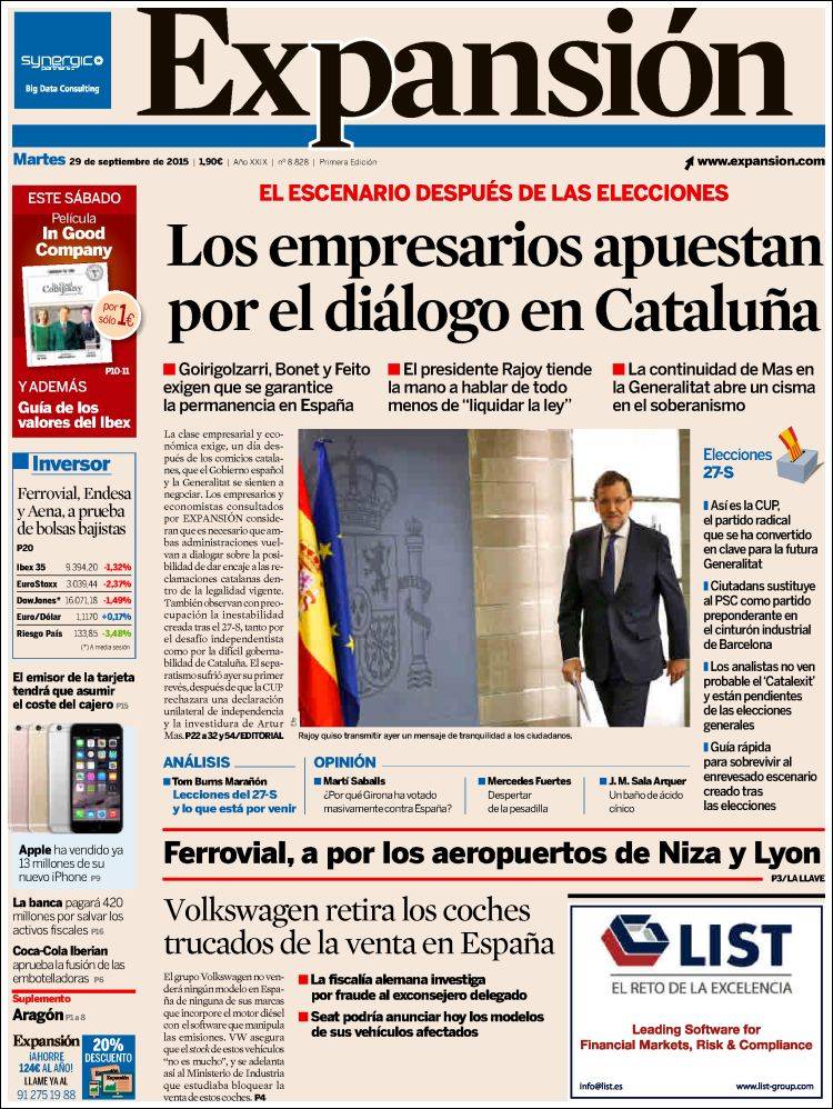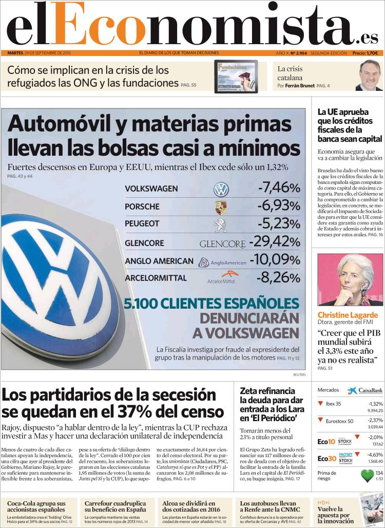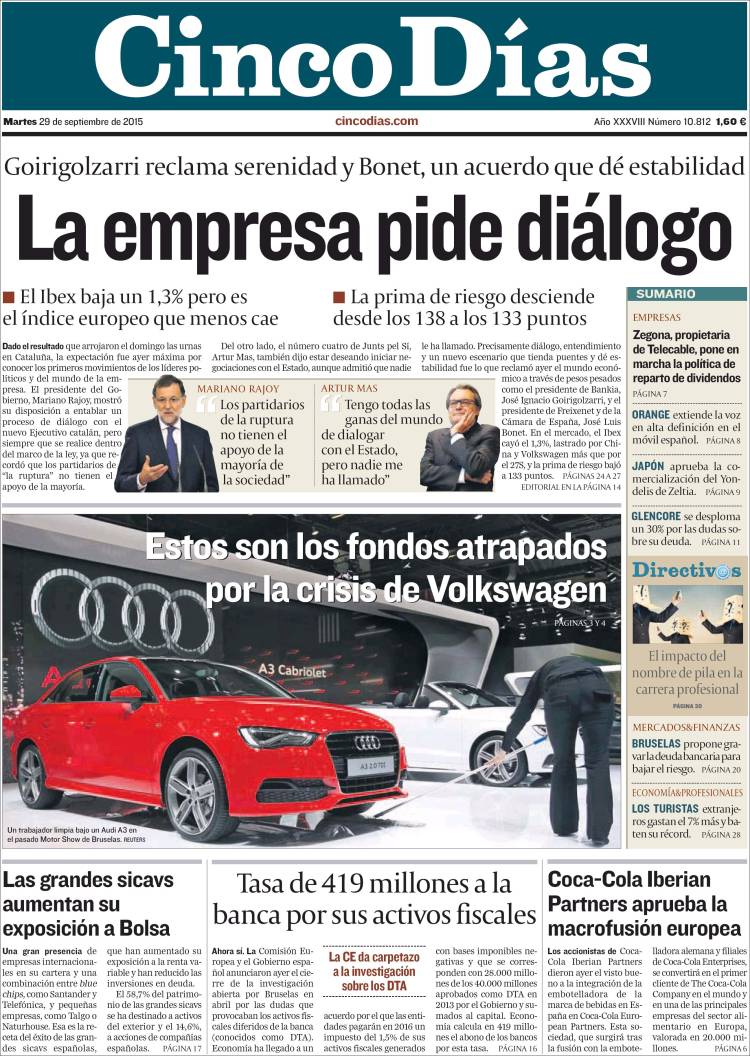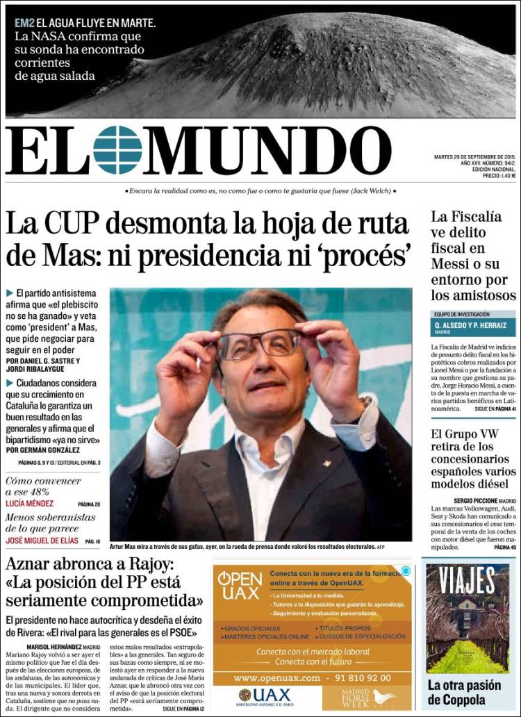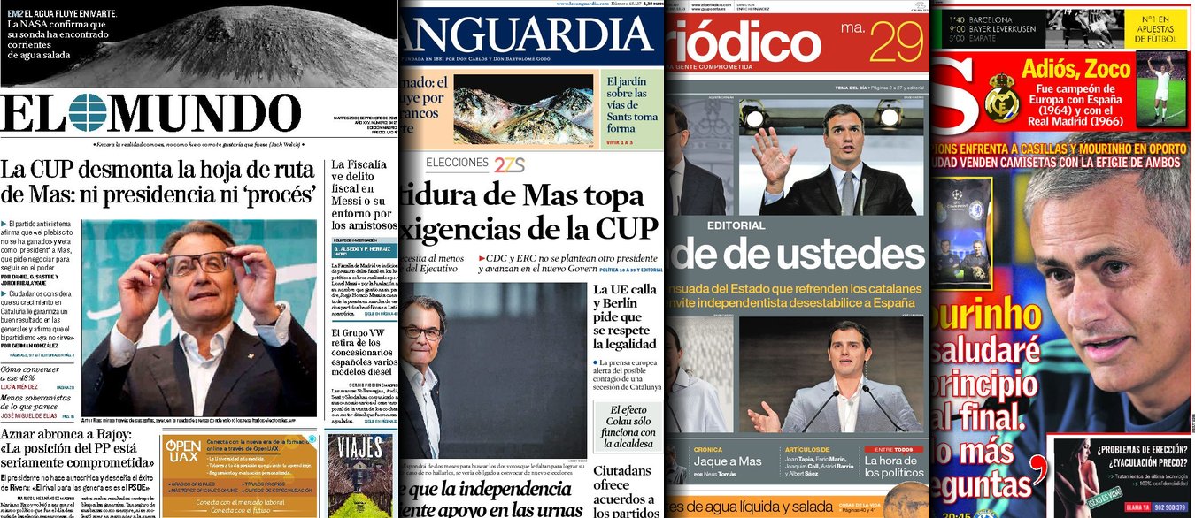 Portadas de los diarios El Mundo, El País, ABC, La Razón, La Vanguardia, El Periódico, Cinco Días, El Economista, Expansión, Marca, As, Mundo Deportivo y Sport.