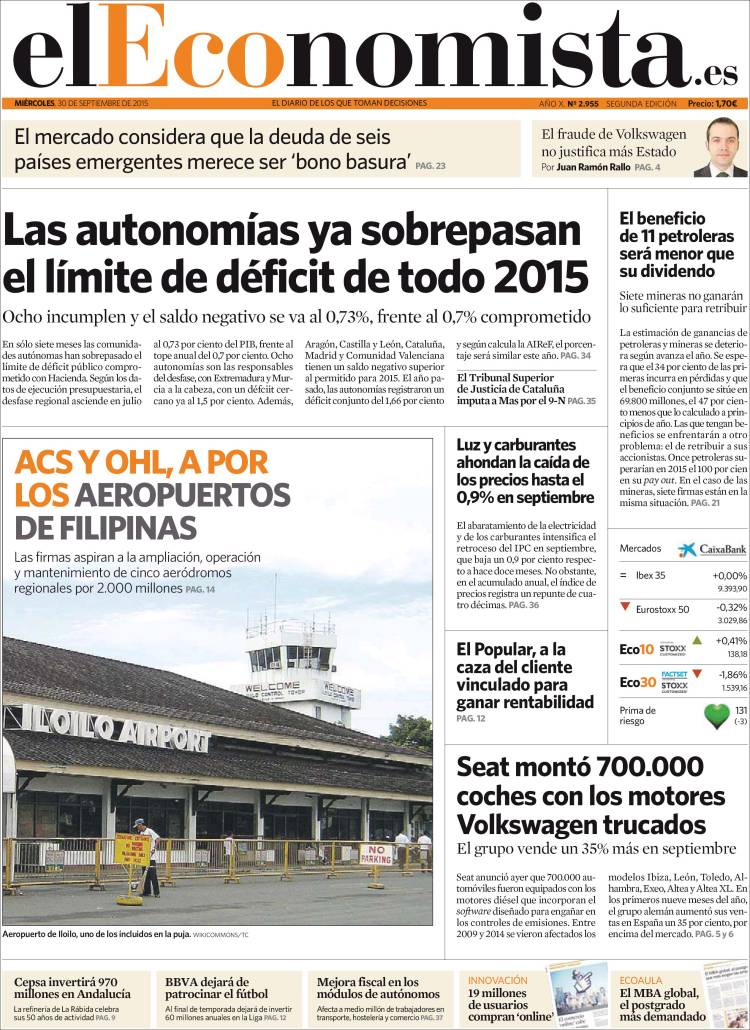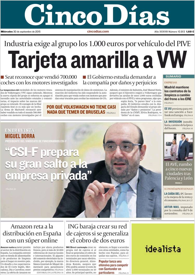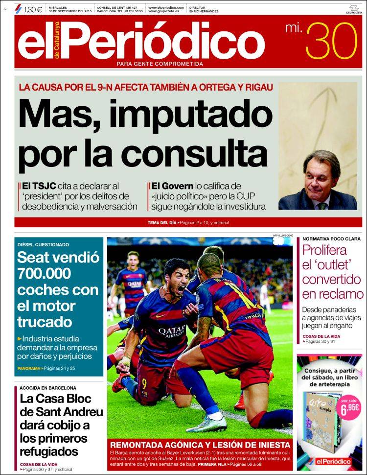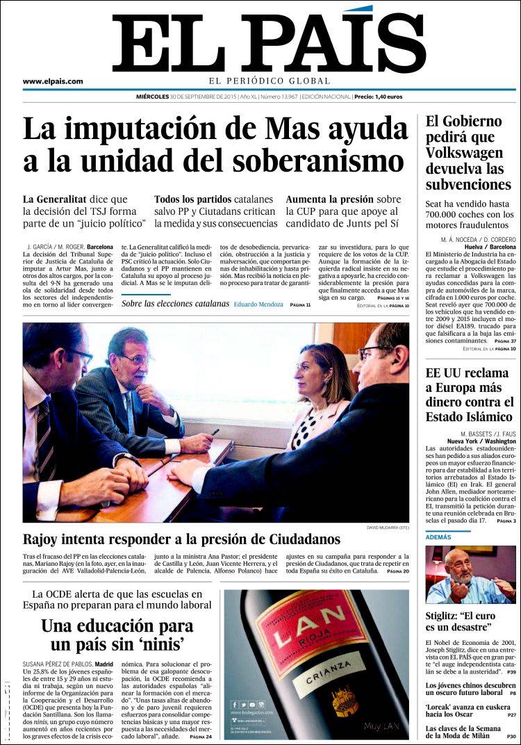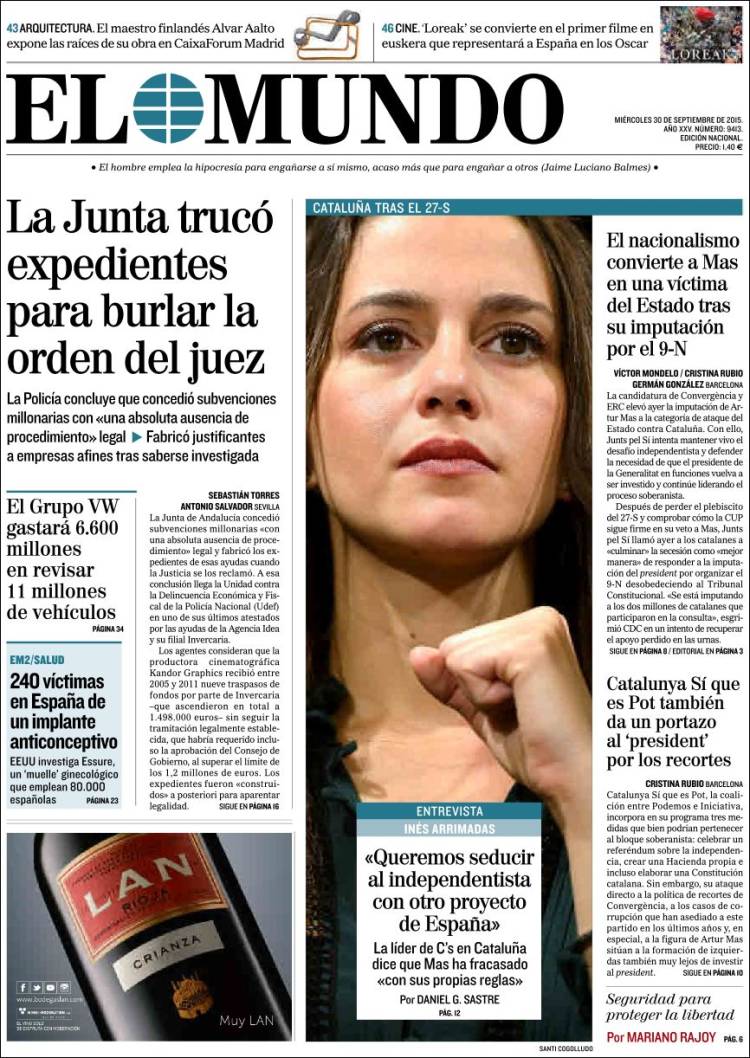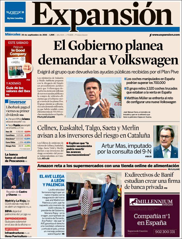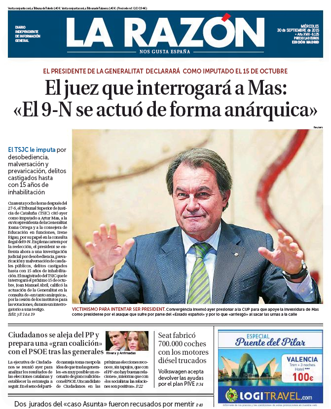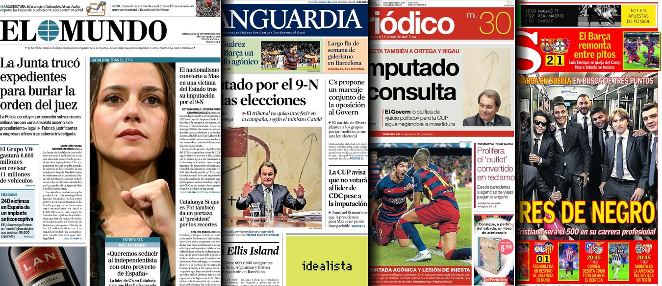 Portadas de los diarios El Mundo, El País, ABC, La Razón, La Vanguardia, El Periódico, Cinco Días, El Economista, Expansión, Marca, As, Mundo Deportivo y Sport.