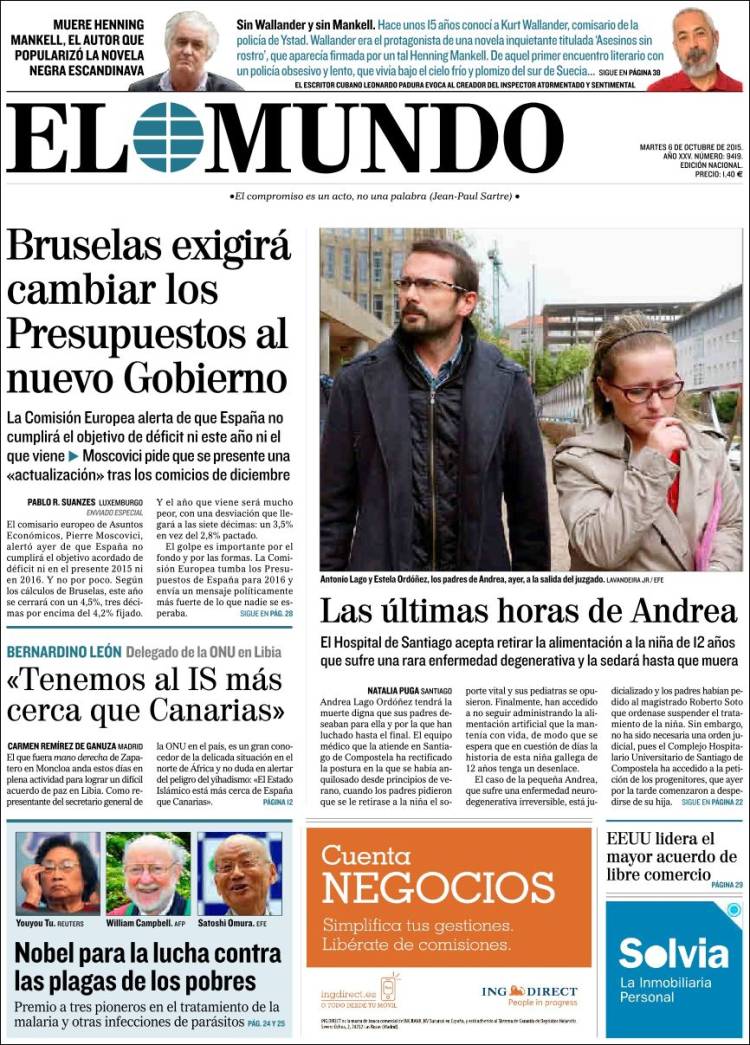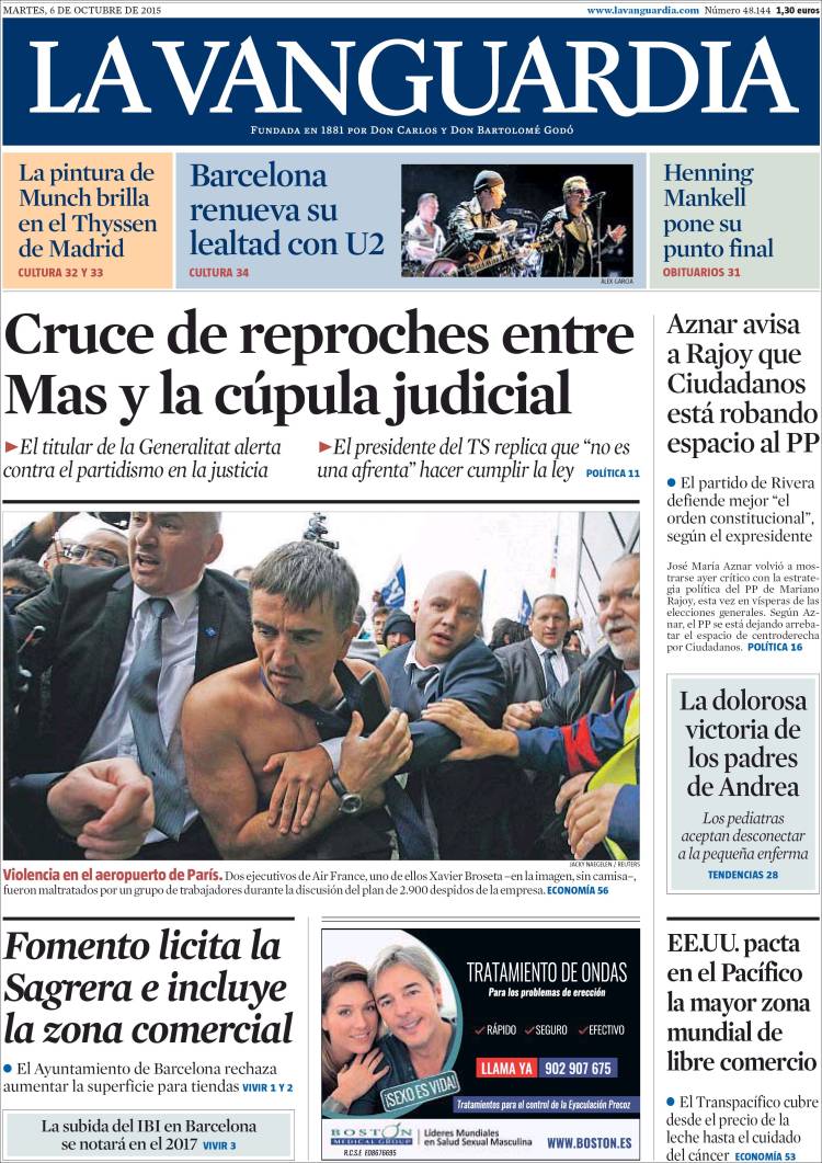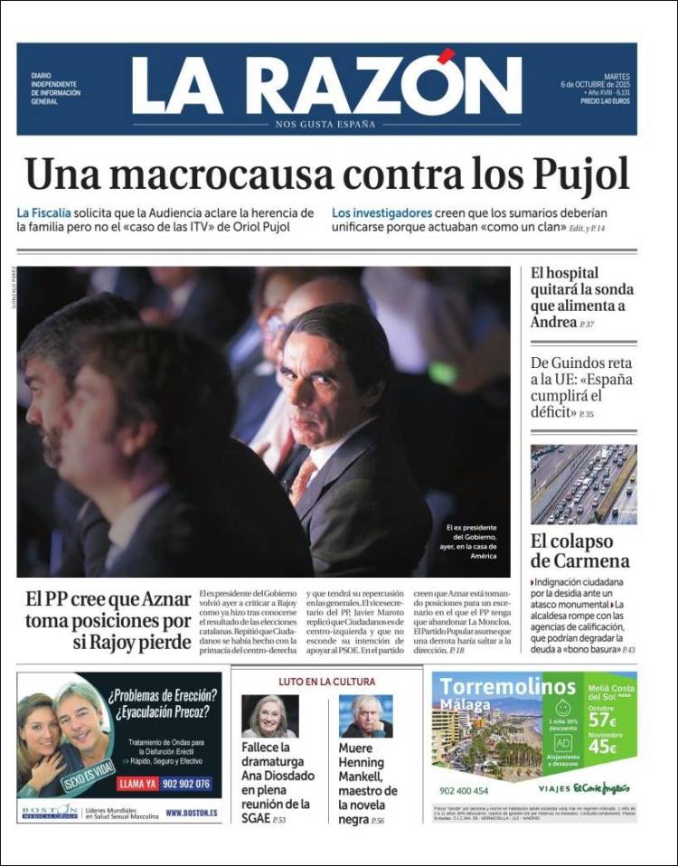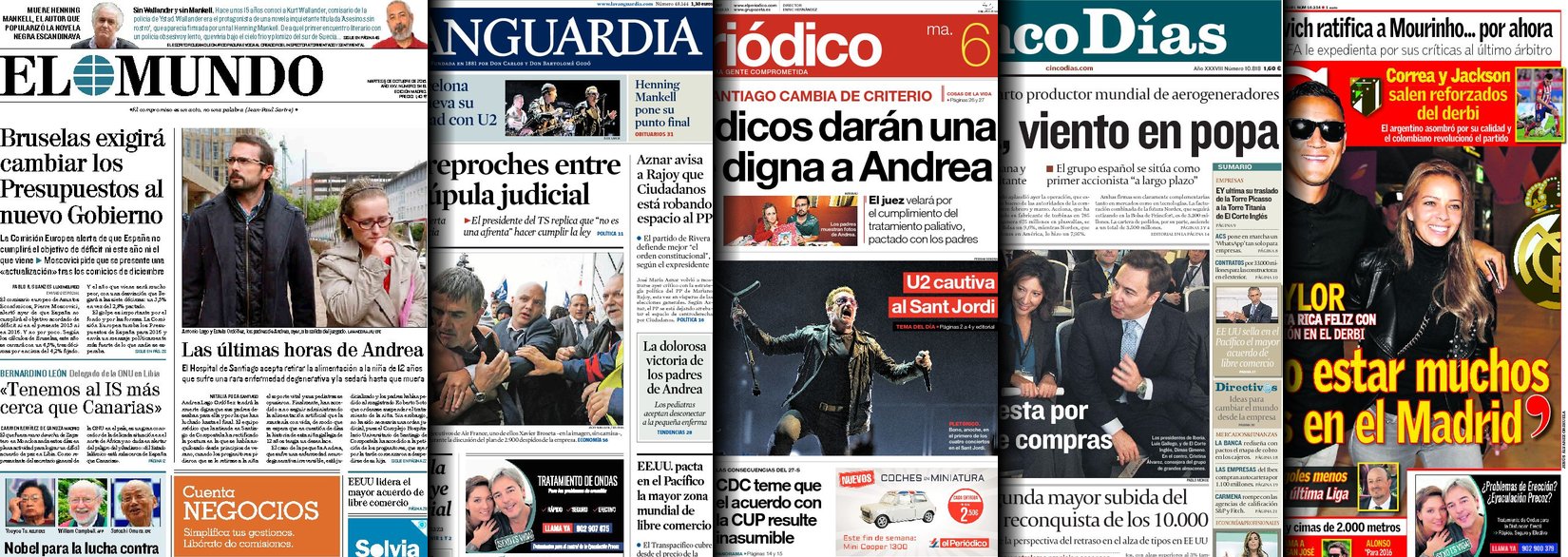 Portadas de los diarios El Mundo, El País, ABC, La Razón, La Vanguardia, El Periódico, Cinco Días, El Economista, Expansión, Marca, As, Mundo Deportivo y Sport.