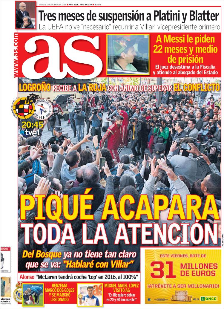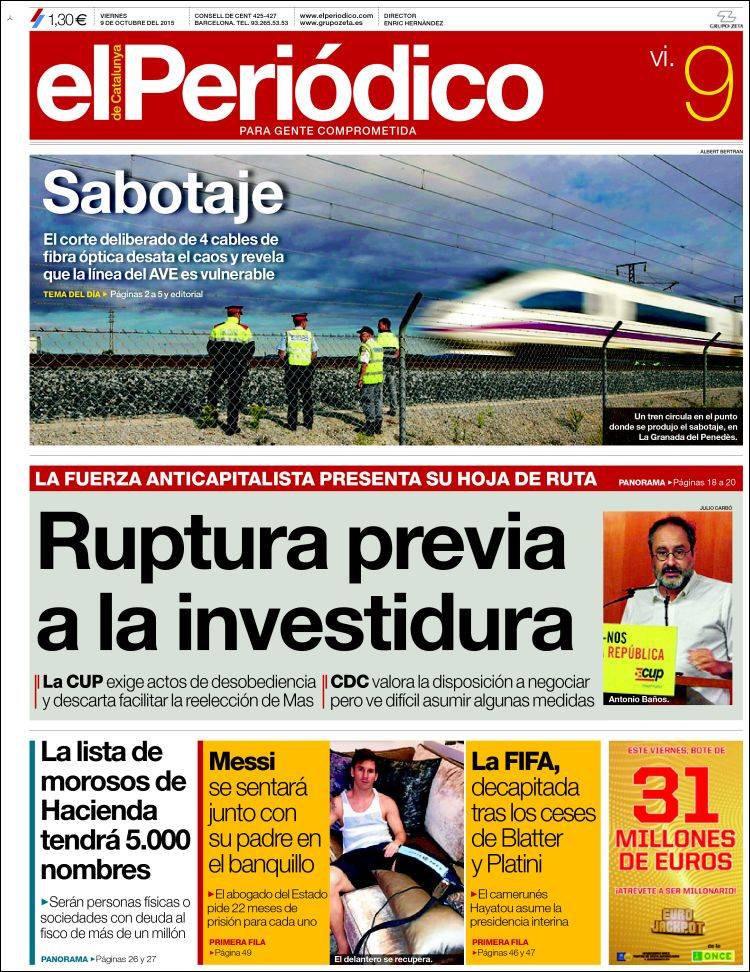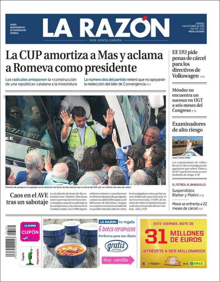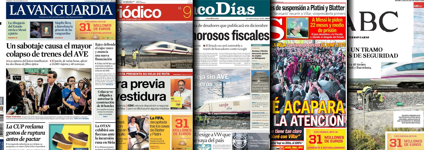 Portadas de los diarios El Mundo, El País, ABC, La Razón, La Vanguardia, El Periódico, Cinco Días, El Economista, Expansión, Marca, As, Mundo Deportivo y Sport.