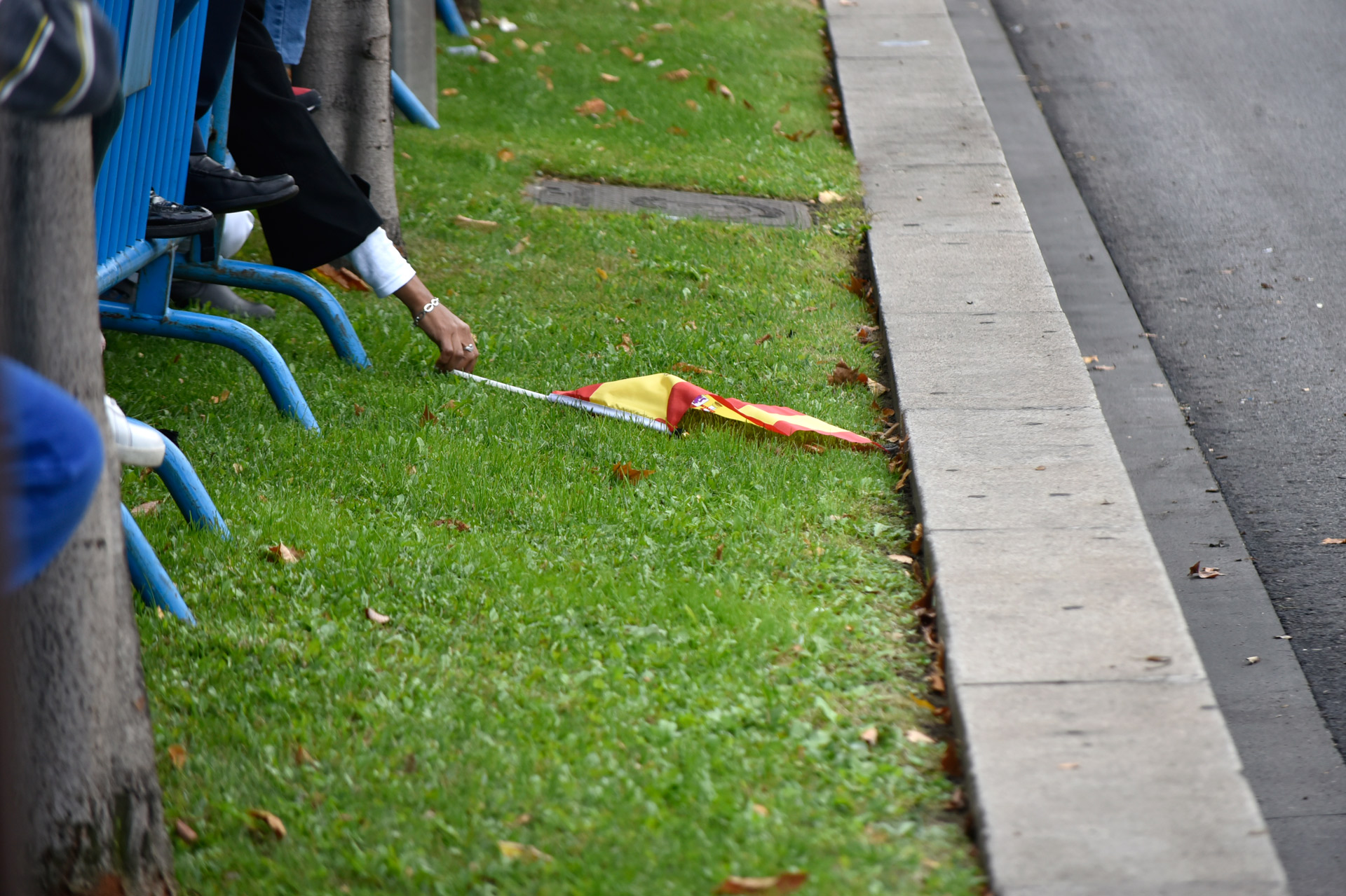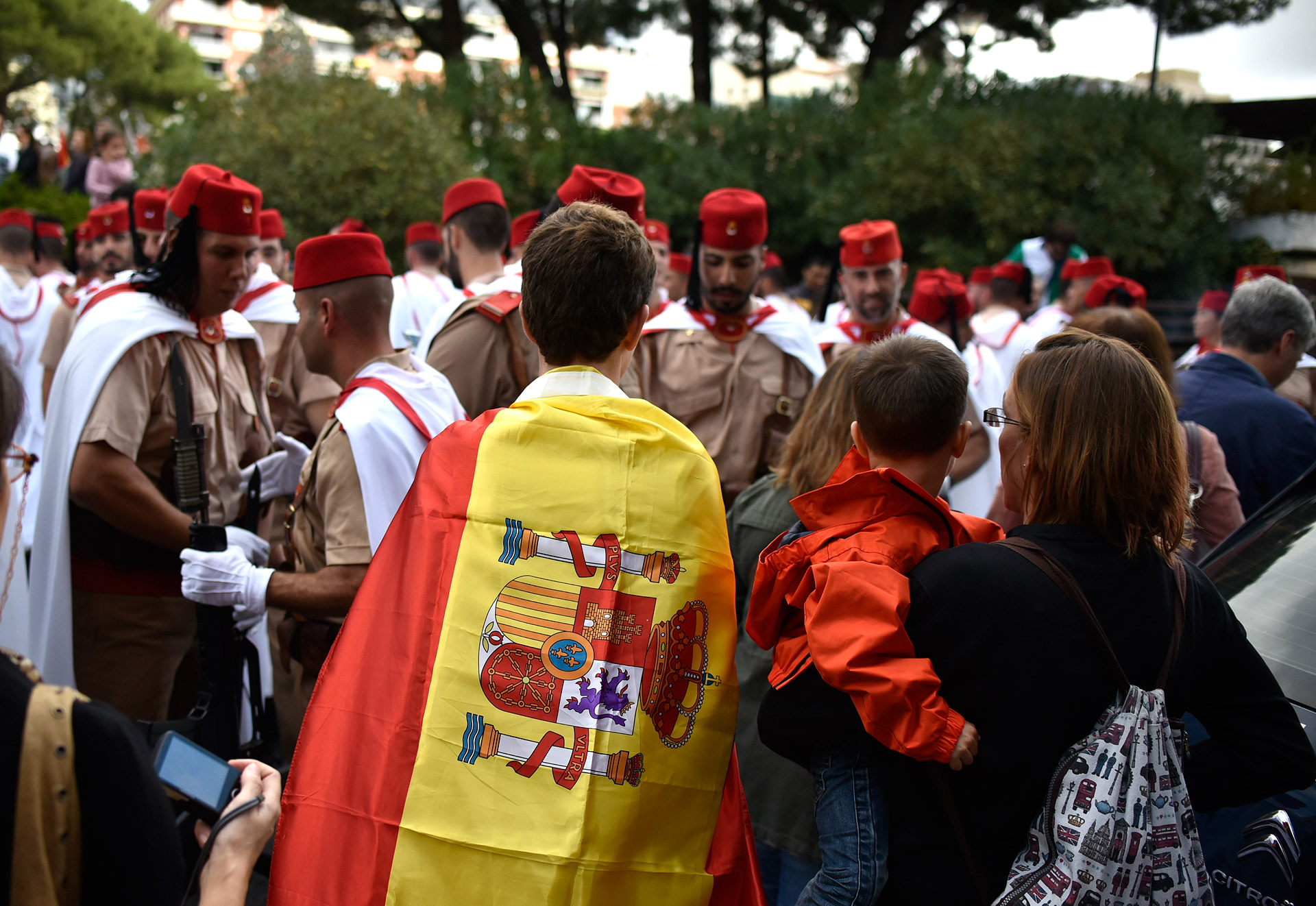 Un adolescente cubierto con la bander de España observa desde la distancia a algunos de los soldados que han participado en el desfile.