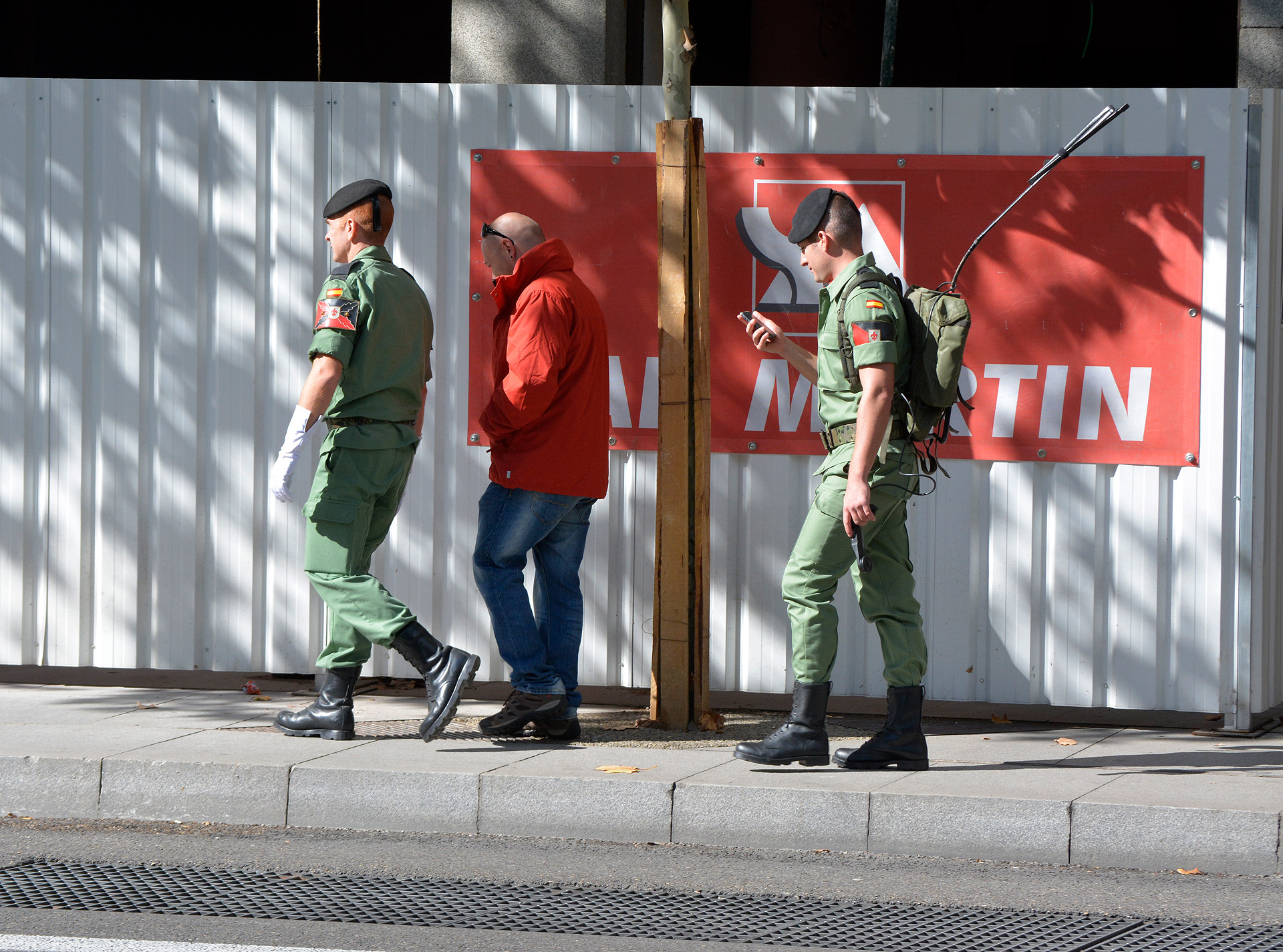 Dos soldados, uno de ellos con una radio, se mezclaban con los civiles en la Calle Serrano, ya finalizado el desfile.