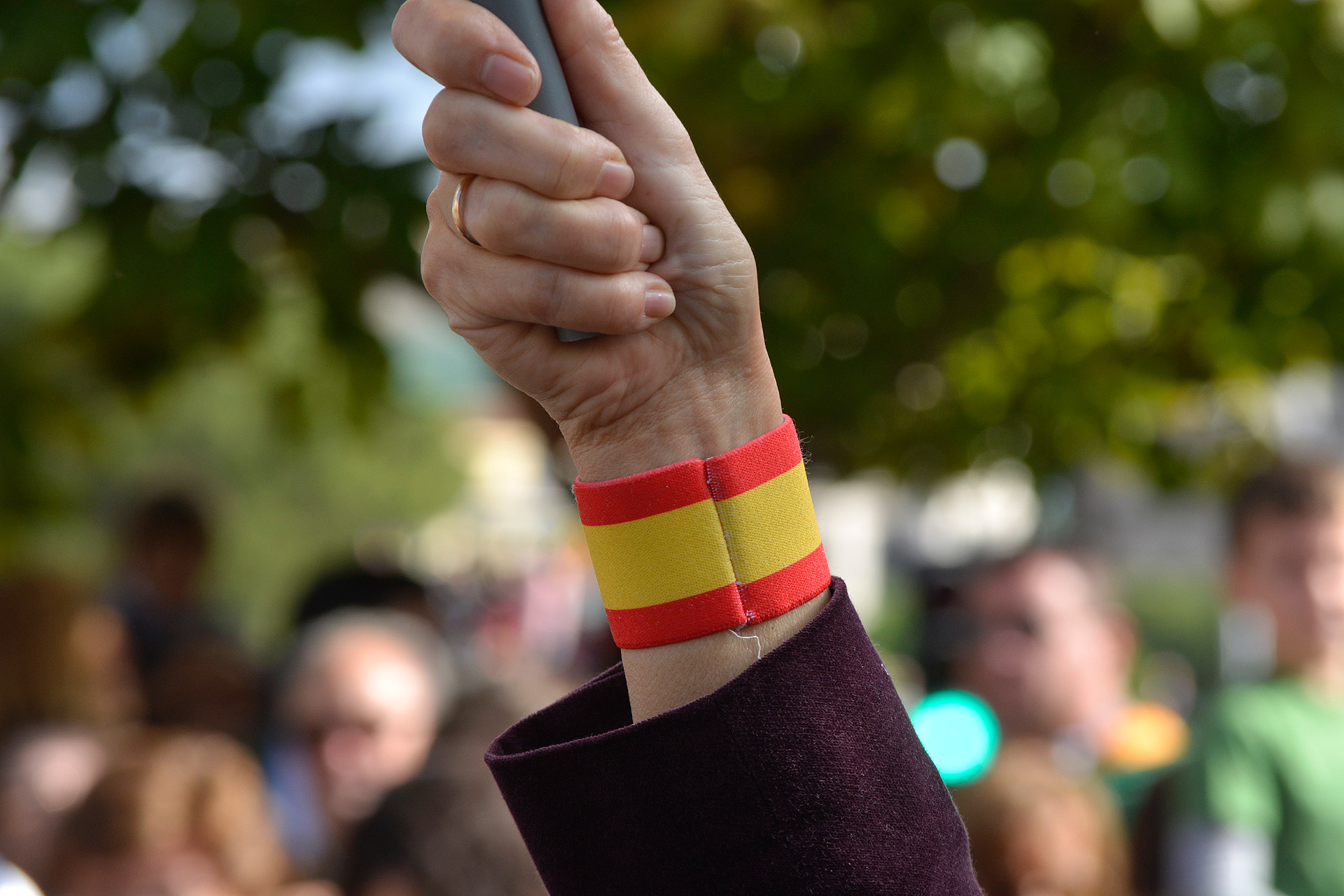 Una enorme bandera de España sobre un nutrido grupo de ciudadanos que en la Plaza de Colón.