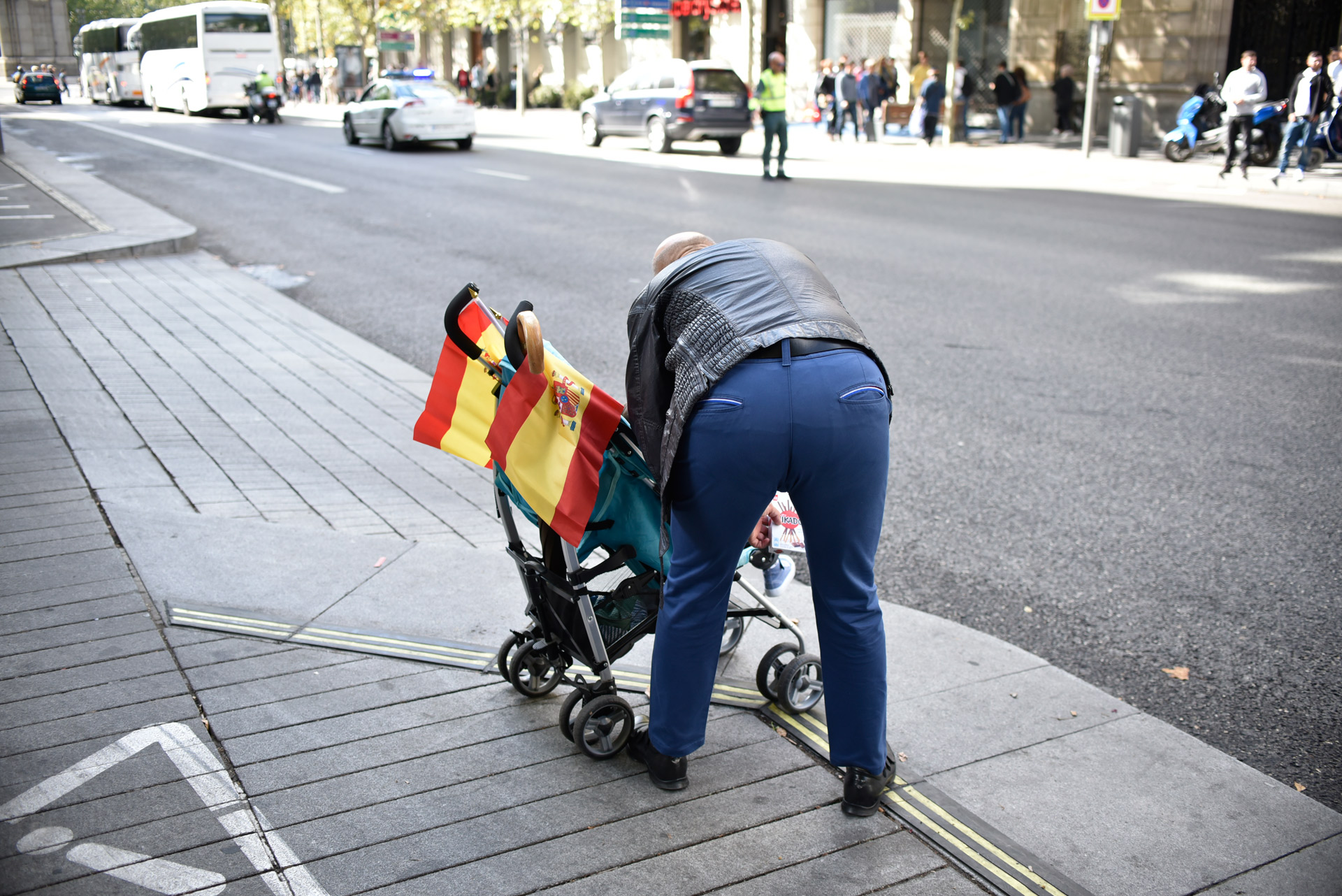 Un hombre cuida de su bebé en un carrito decorado con dos banderas de España.