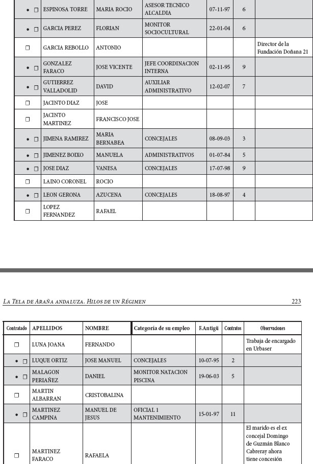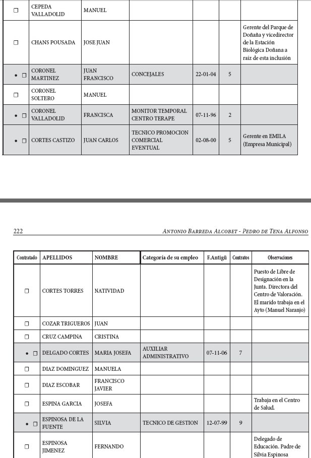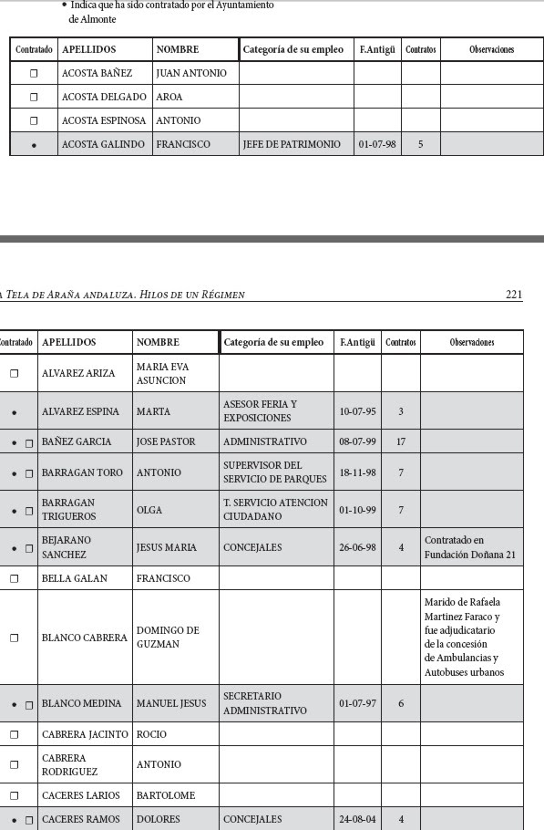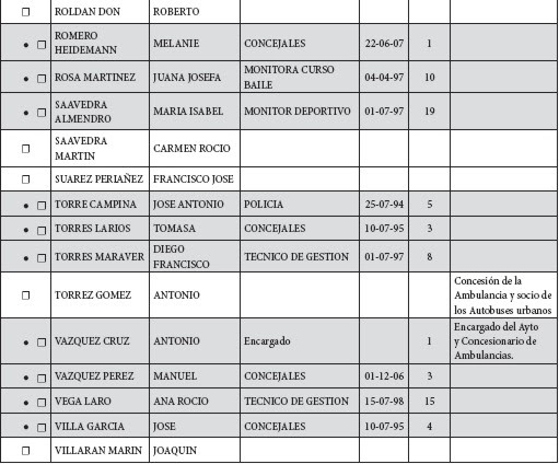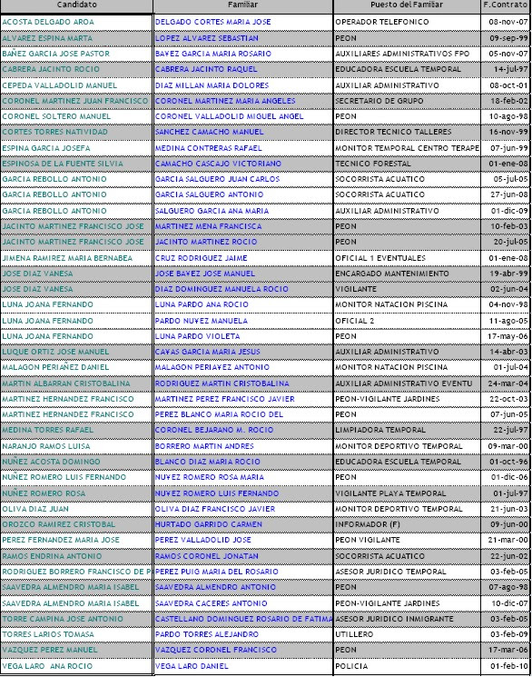 Los miembros de las candidaturas desde 1991 a 2011 que habían tenido o tienen relaciones laborales, concesiones o ayudas con el Ayuntamiento de Almonte, que dirige el socialista Francisco Bella, eran estos: