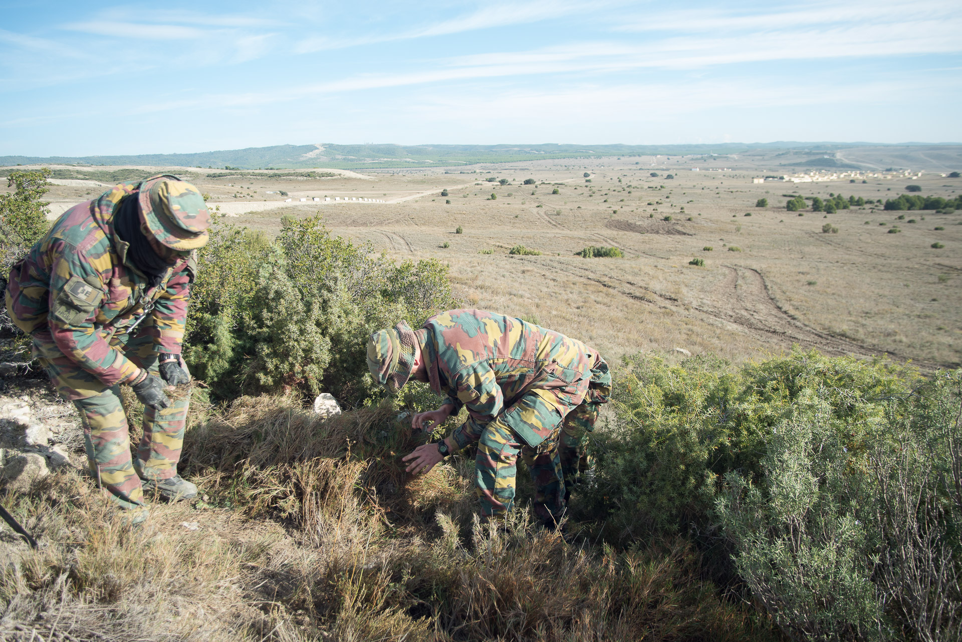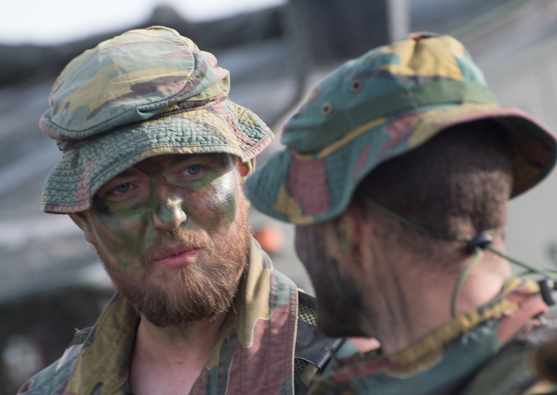 Como parte de la exhibición un grupo de soldados camufla a un compañero junto a los periodistas