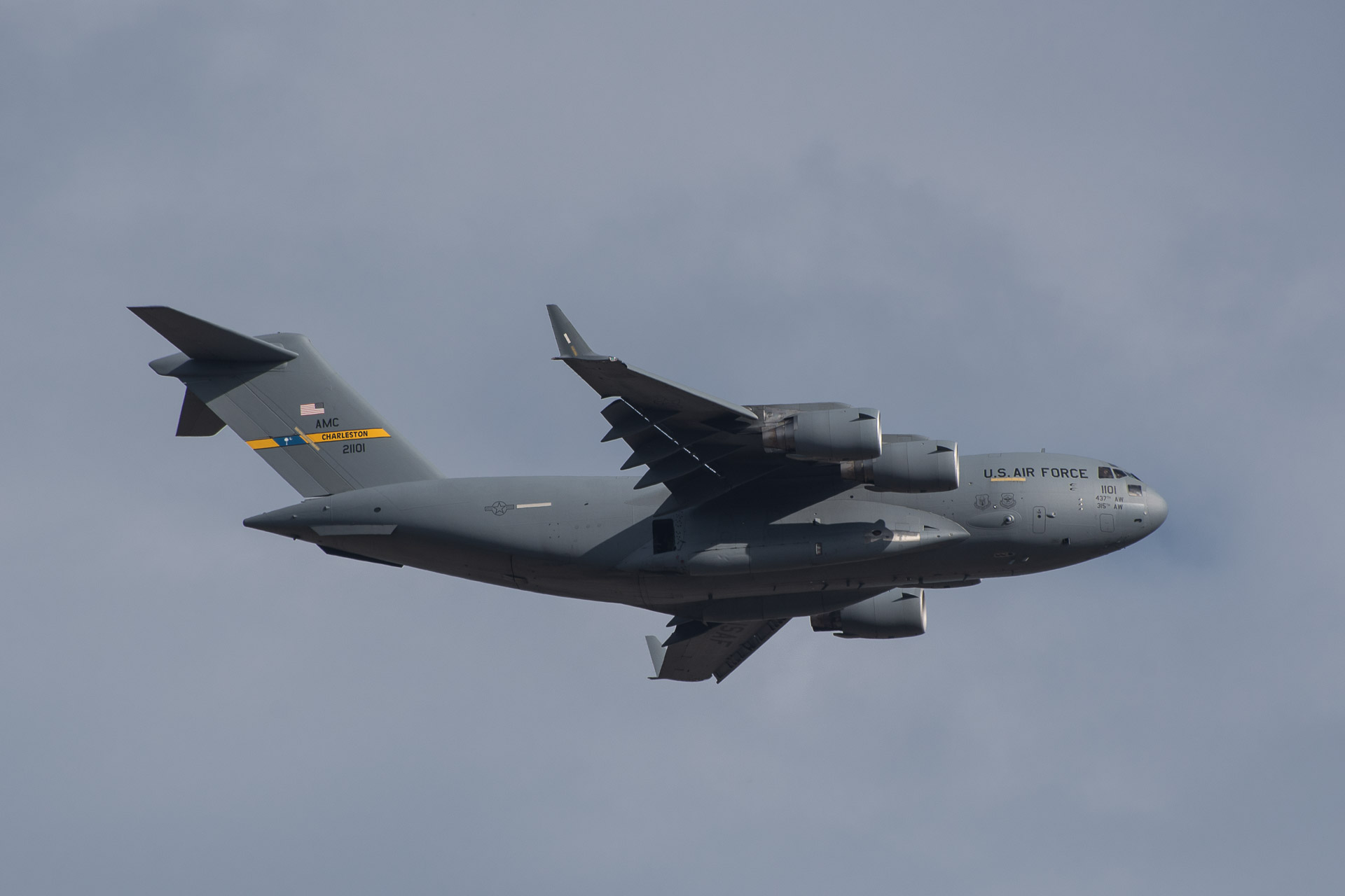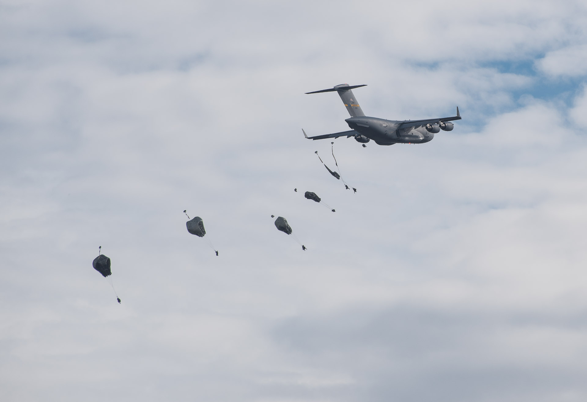 Reporteros gráficos atentos a la llegada de los impresionantes C17 desde los que iban a saltar 550 paracaidistas