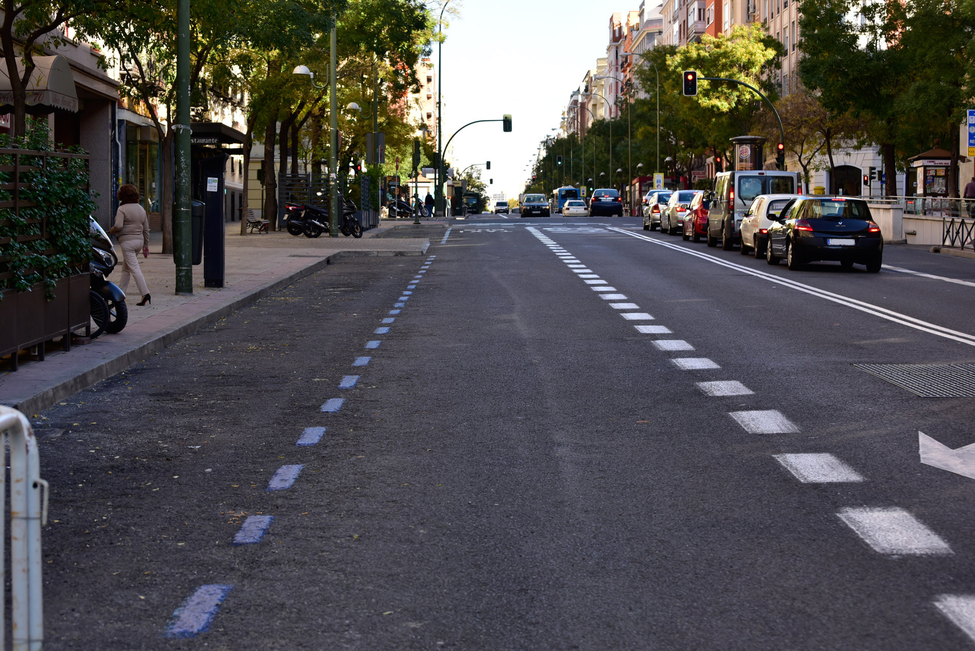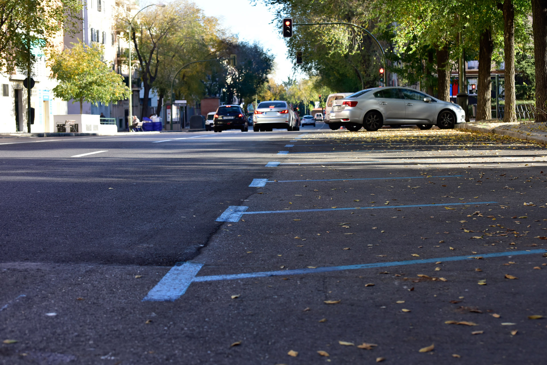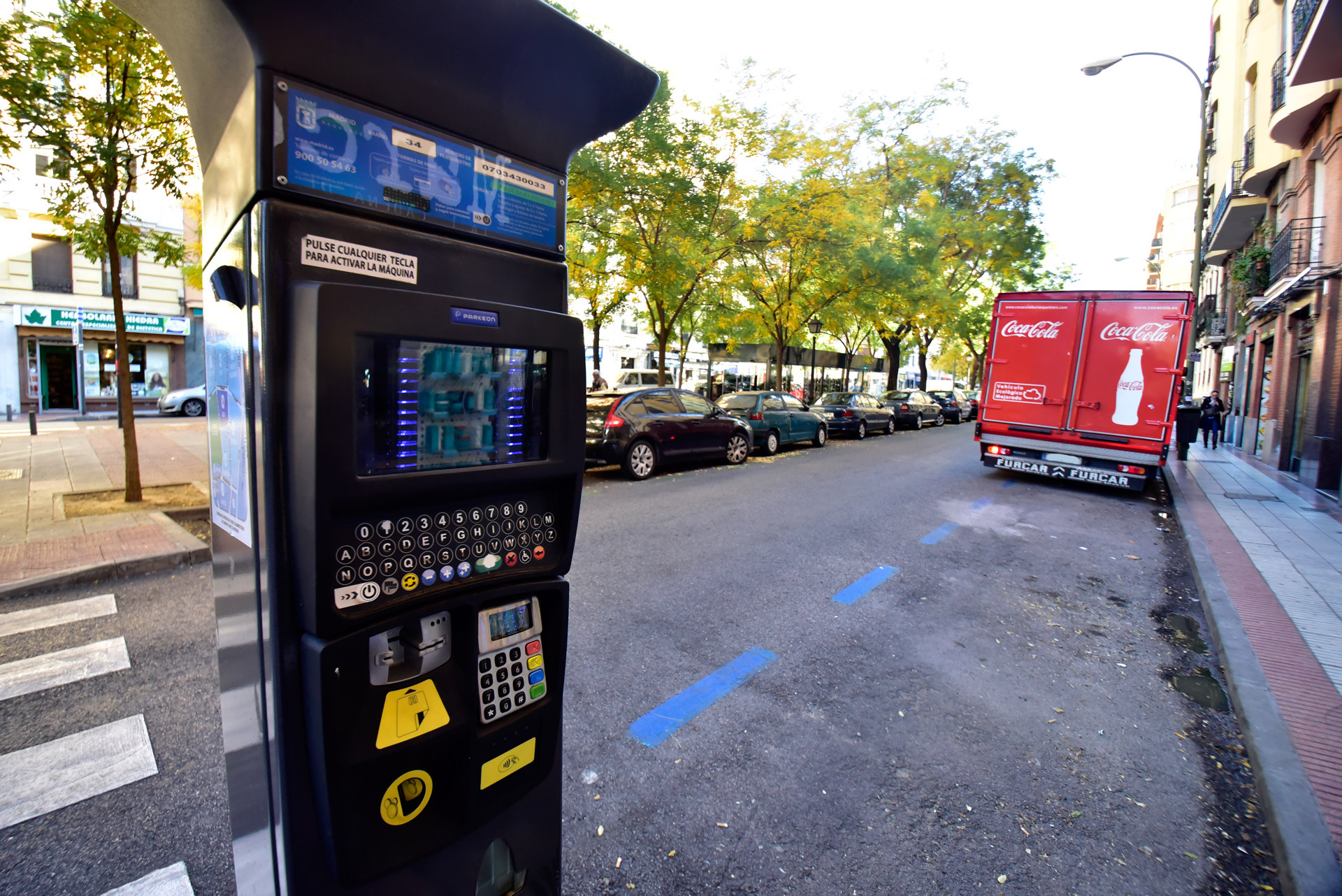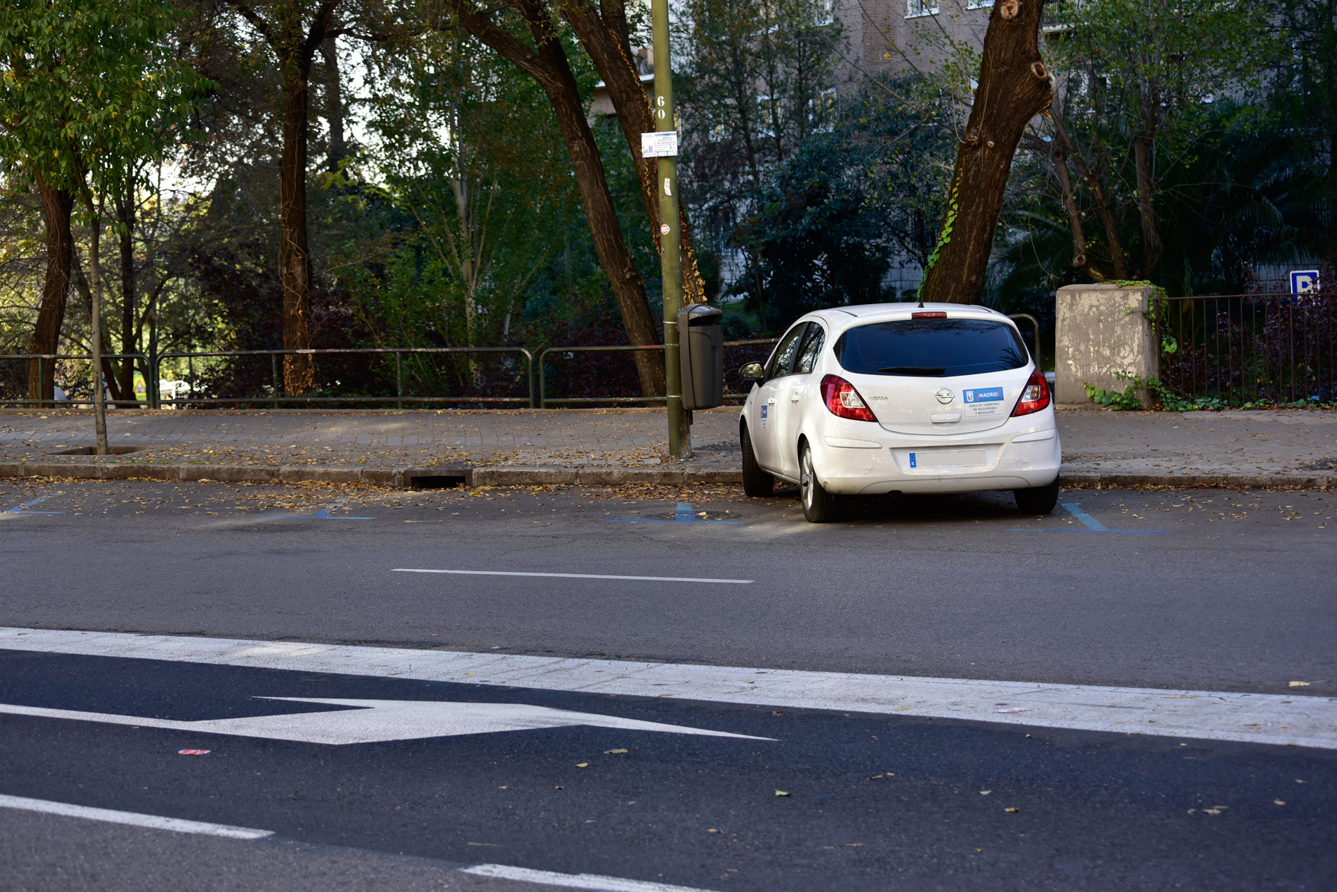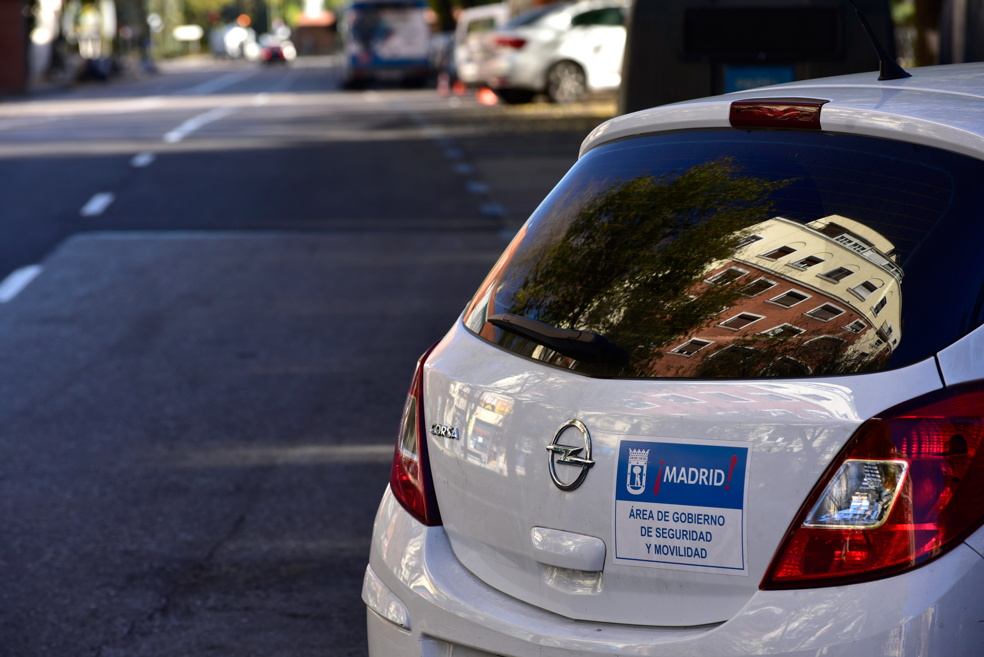 Curiosamente el único coche aparcado en una de las zonas azules de la capital es el vehículo del Área de Gobierno de Seguridad y Movilidad del Ayuntamiento de Madrid.