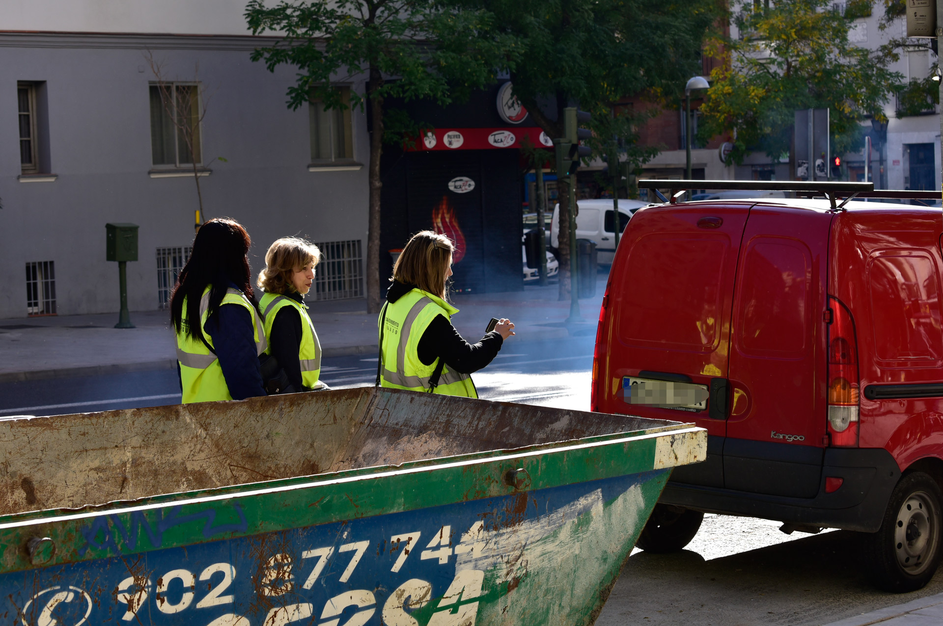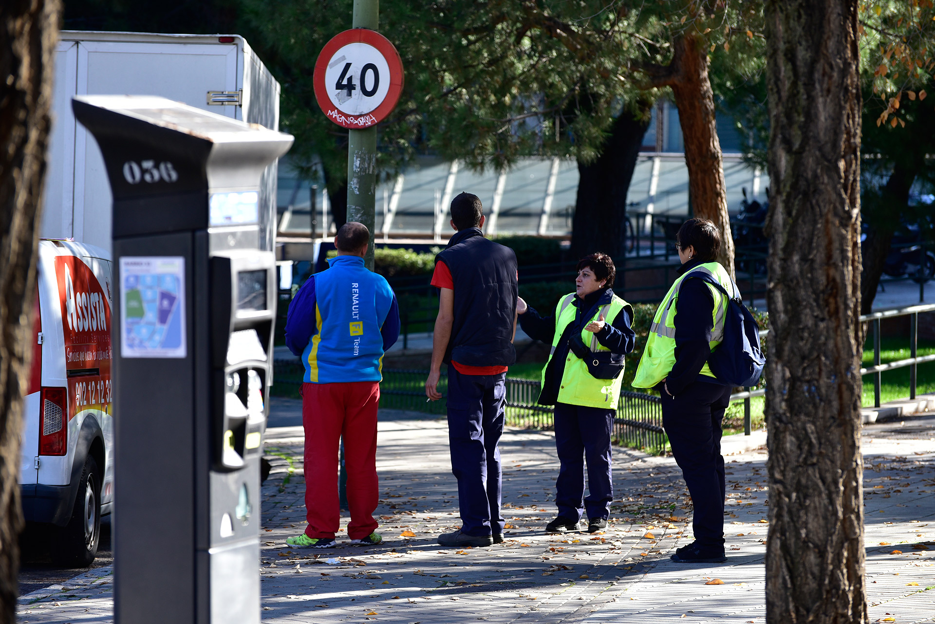 Dos trabajadores preguntaban a dos controladoras del SER sobre la posibilidad de aparcar sus vehículos de empresa.