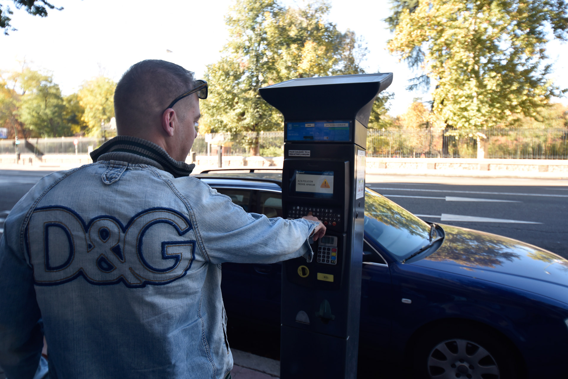 Un ciudadano intenta acceder al panel de uno de lo parquímetros en la zona centro de Madrid.