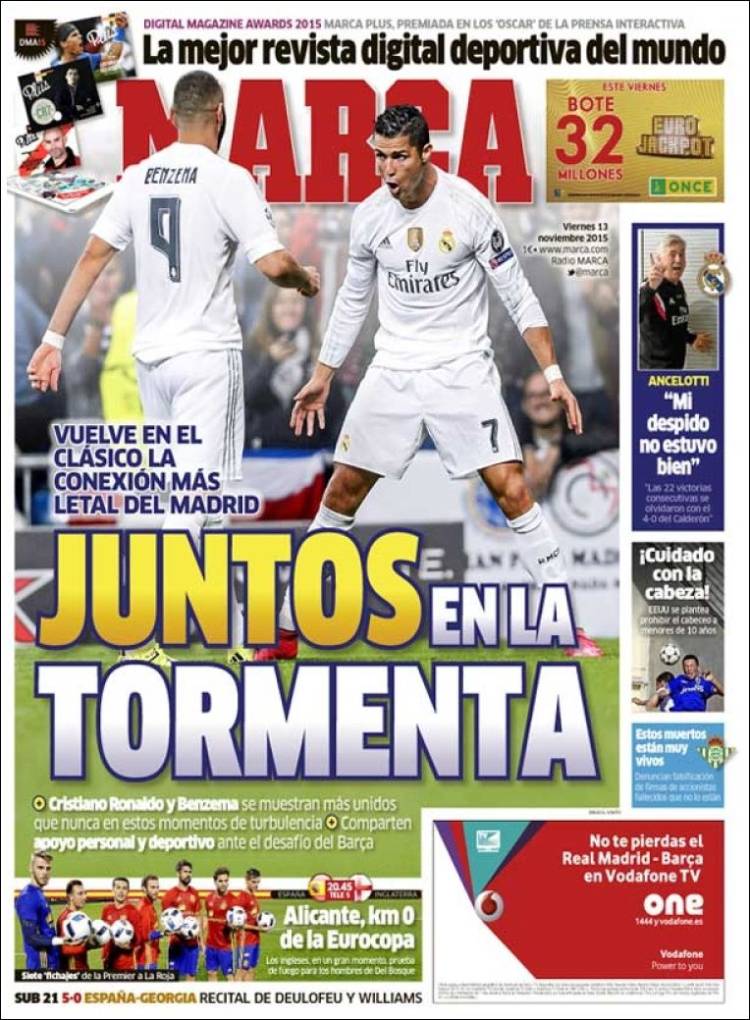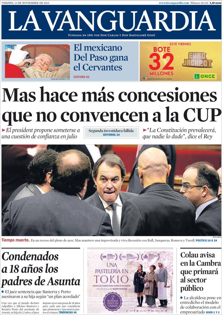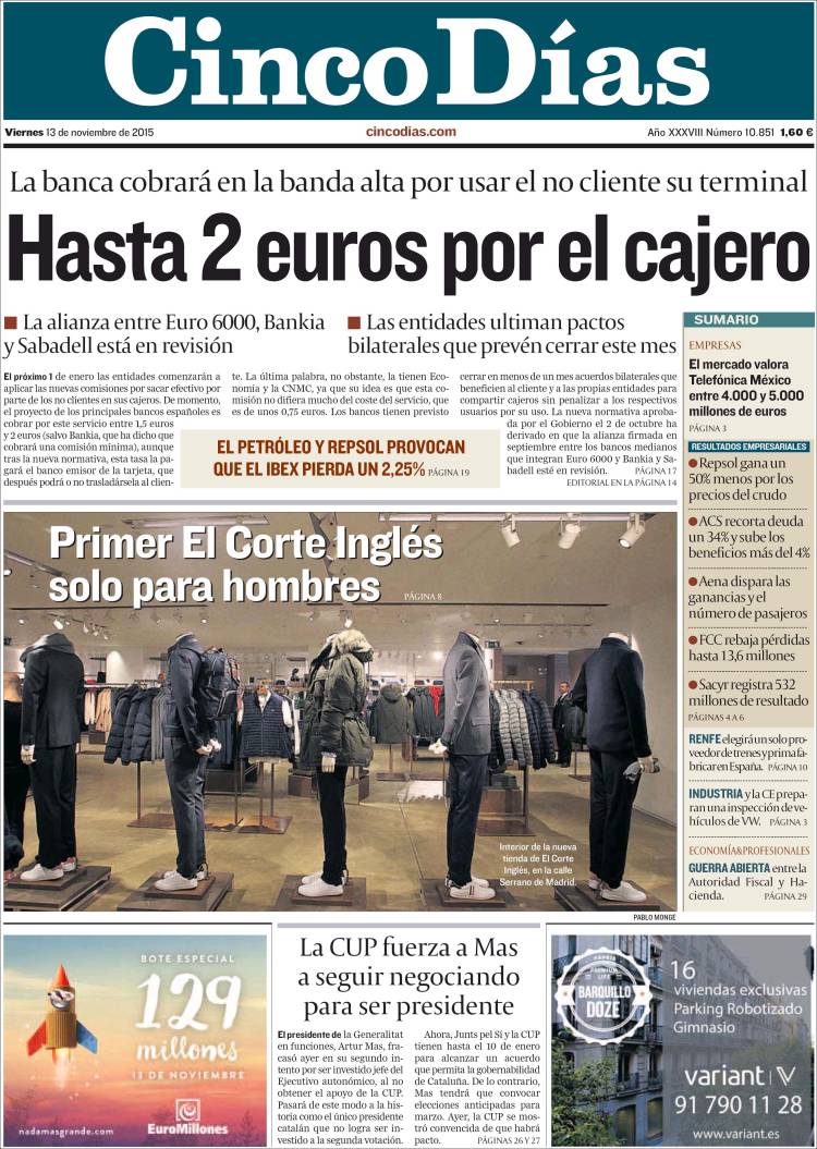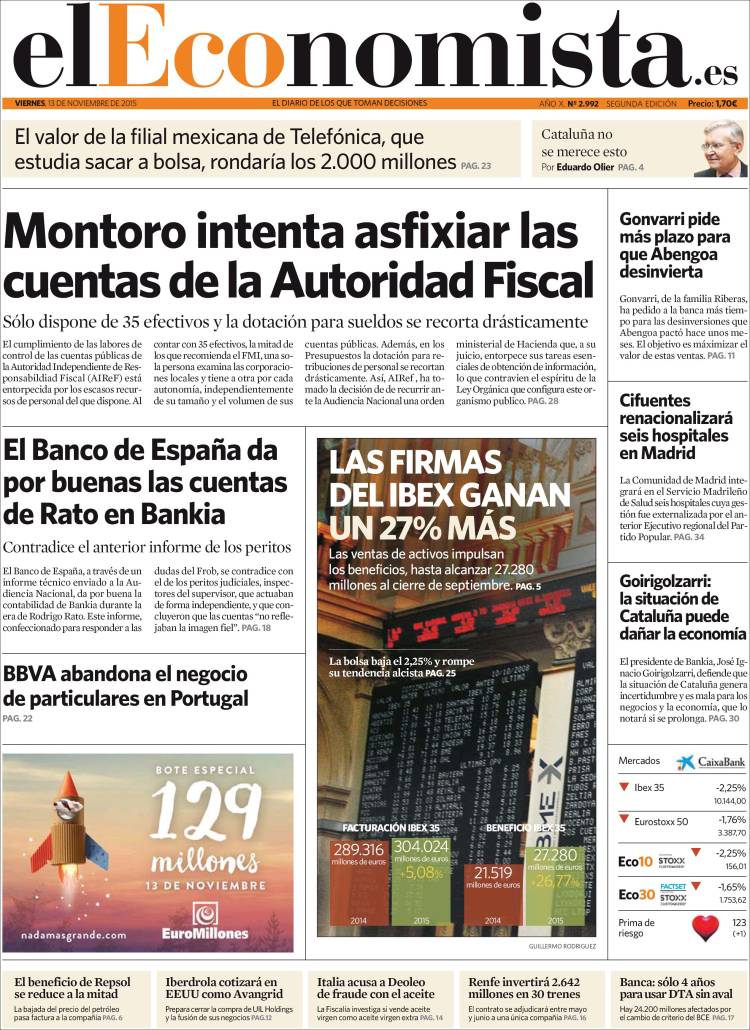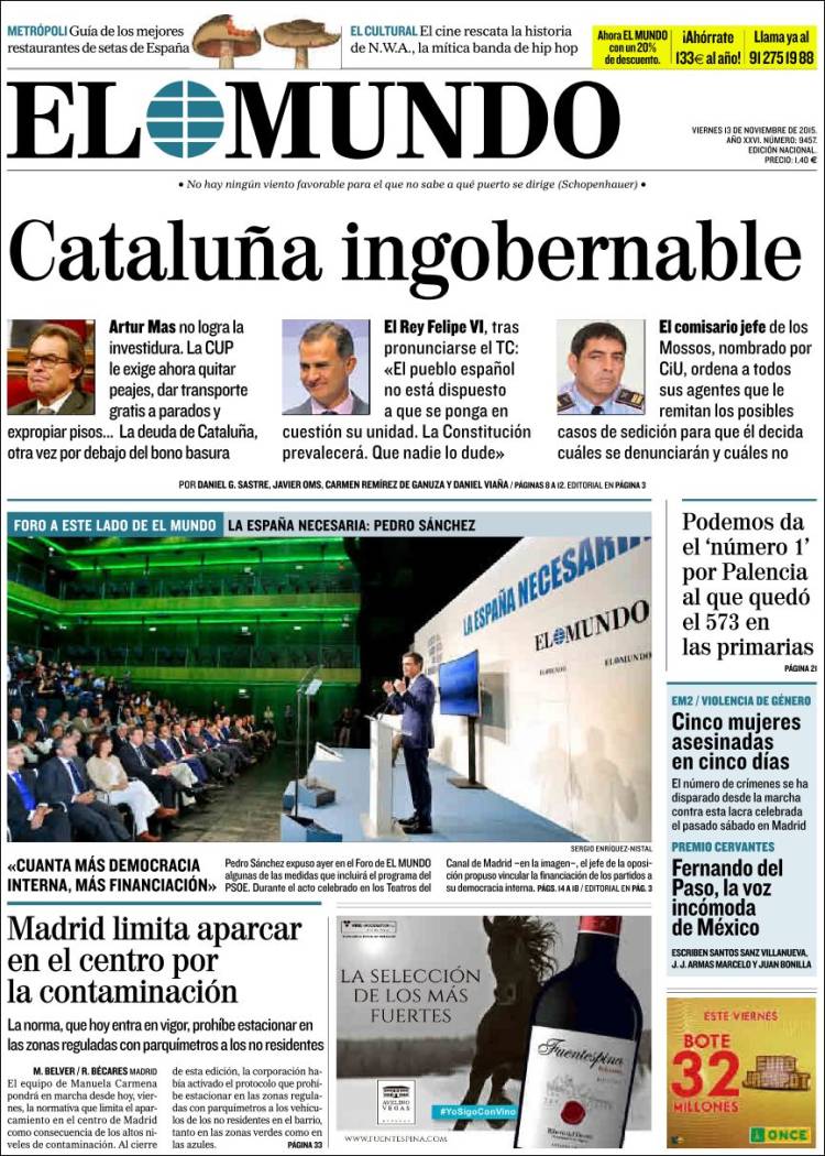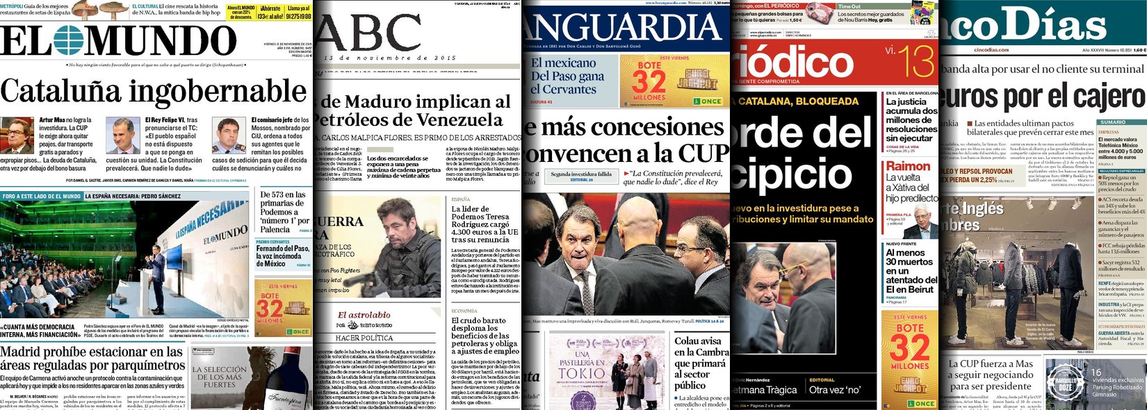 Portadas de los diarios El Mundo, El País, ABC, La Razón, La Vanguardia, El Periódico, Cinco Días, El Economista, Expansión, Marca, As, Mundo Deportivo y Sport.