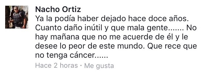 En su cuenta de Facebook señaló: "Ya la podía haber dejado hace doce años. Cuanto (sic) daño inútil y que (sic) mala gente….. No hay mañana que no me acuerde de él y le desee lo peor de este mundo. Que rece que no tenga cáncer…"