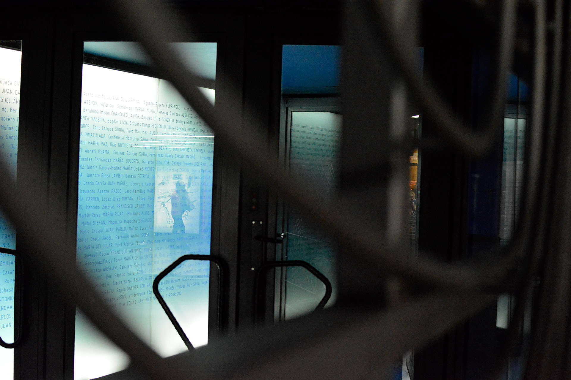 No es posible acceder a la sala del monumento y desde fuera sólo se puede ver una parte del panel con los nombres de los fallecidos el 11-M.