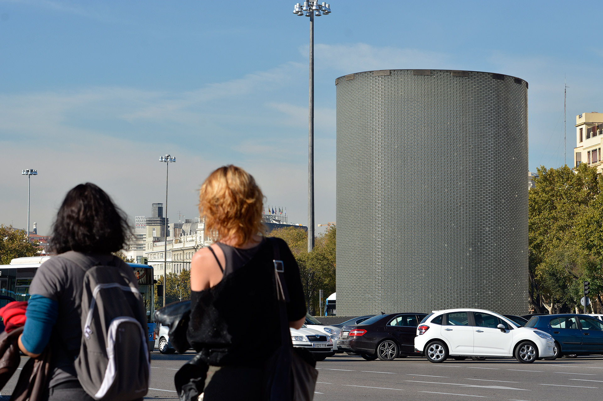 En la calle, dos mujeres observan el monumento a las víctimas del 11-M en Atocha desde la calle.