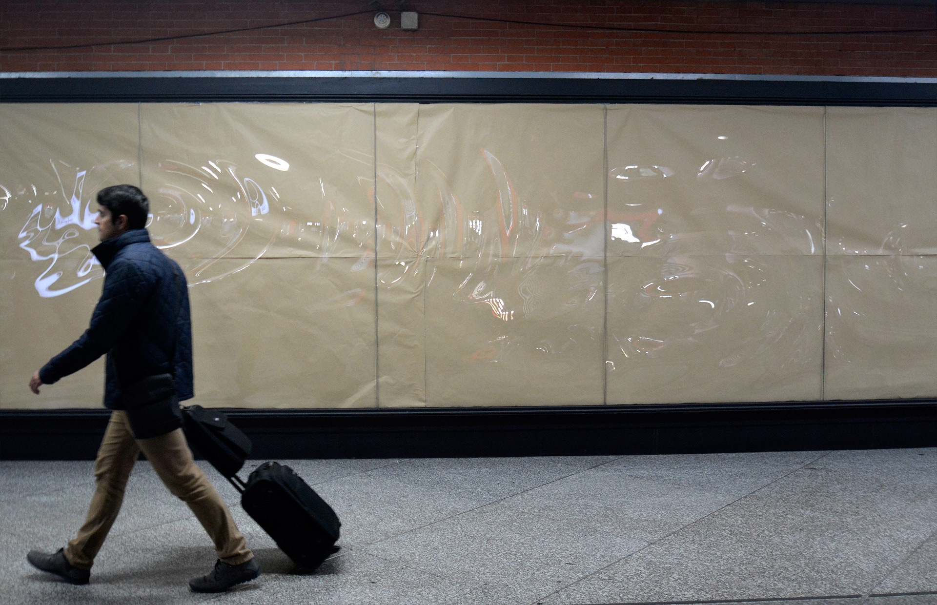 Un viajero camina al lado de la entrada al monumento tapada completamente con papel.