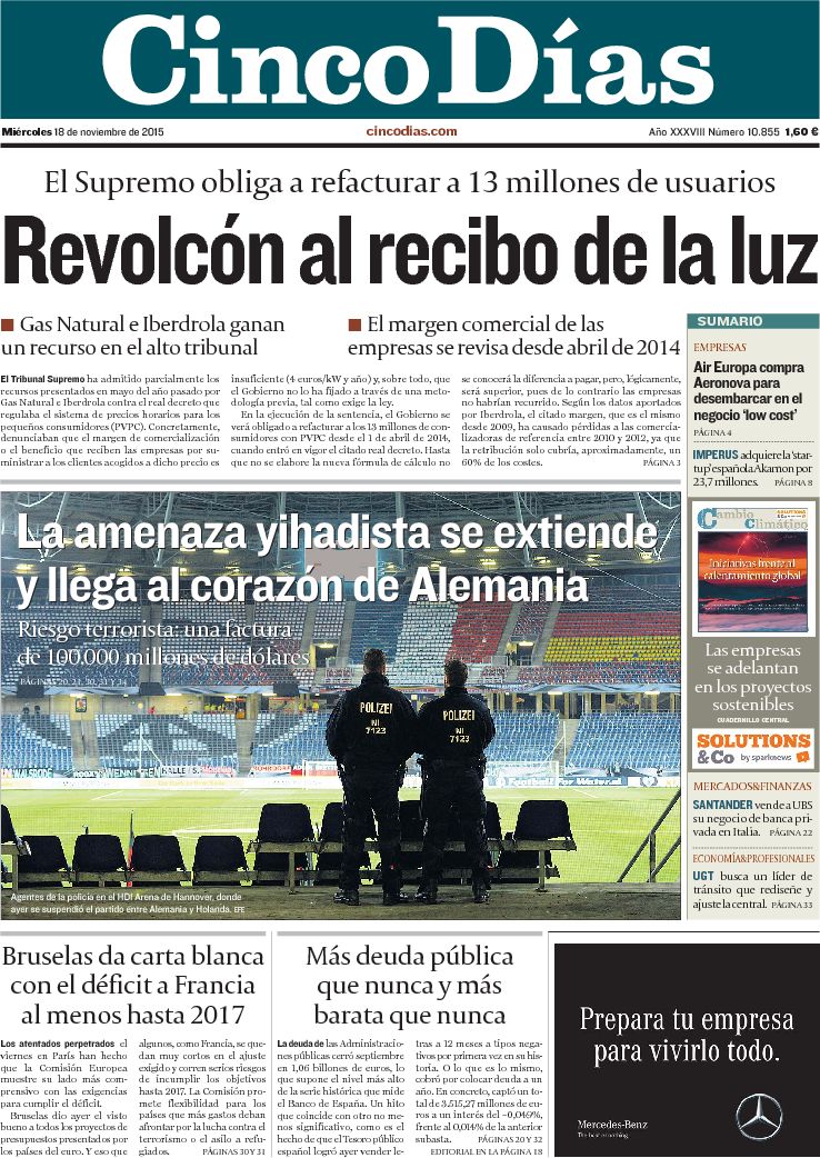 Portadas de los diarios ABC, As, Cinco Días, El Periódico y La Vanguardia.