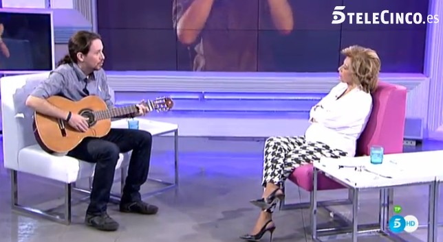 Cinco minutos de entrevista en ¡Qué tiempo tan feliz! le bastaron a Pablo Iglesias para coger la guitarra y entonar la nana Canta negrito a María Teresa Campos. El líder de Podemos participó este sábado en el programa de Telecinco en busca del voto de los mayores y las amas de casa.