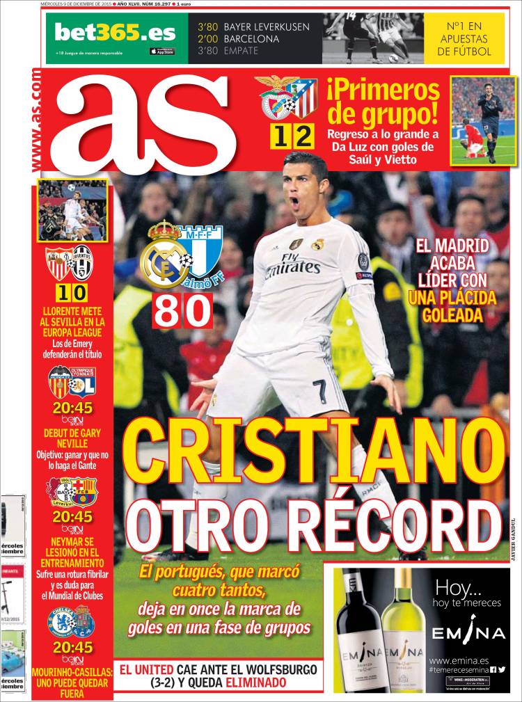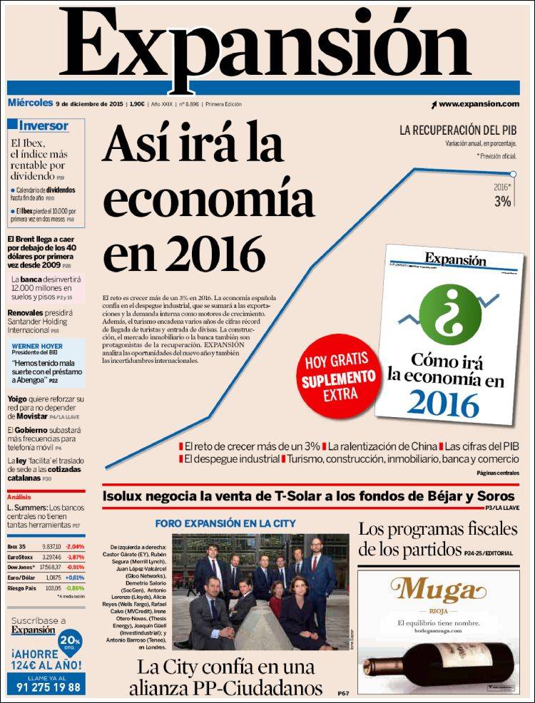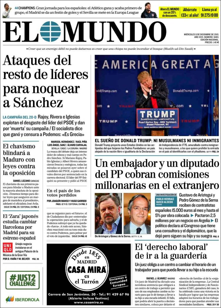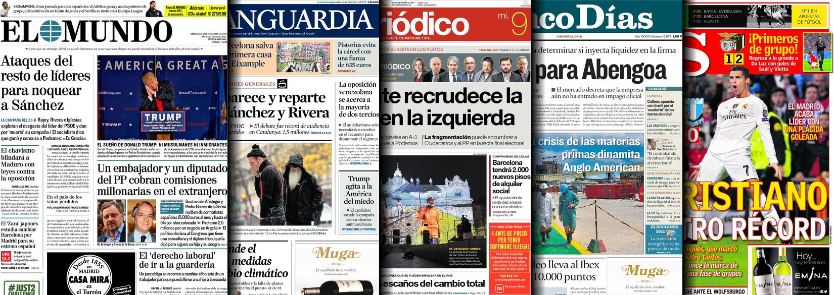 Portadas de los diarios El Mundo, El País, ABC, La Razón, La Vanguardia, El Periódico, Cinco Días, El Economista, Expansión, Marca, As, Mundo Deportivo y Sport.