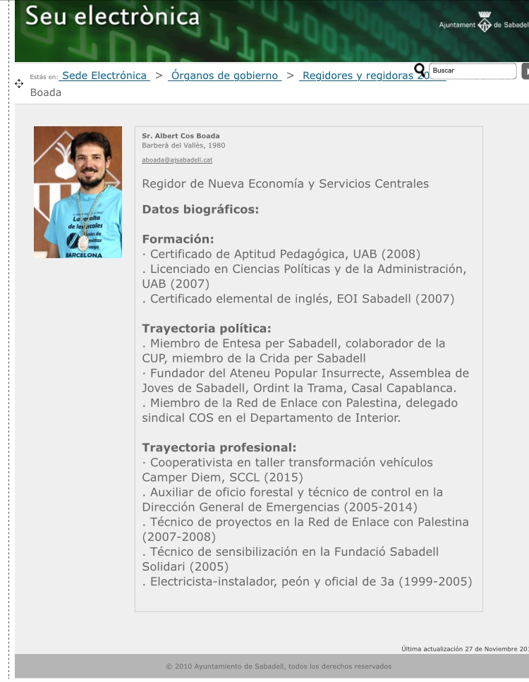 Sabadell ha pasado de manos socialistas a un grupo de gobierno formado por ERC (tres concejales y el alcalde, Juli Fernàndez), la versión local de la CUP (cuatro), "Unitat pel Canvi" ("Iniciativa per Catalunya", también con cuatro) y "Guanyem", Podemos en la ciudad, con dos. Suman catorce ediles frente a los trece de la oposición: cinco socialistas, cuatro convergentes, tres de Ciudadanos y Gesa, único representante del PP.