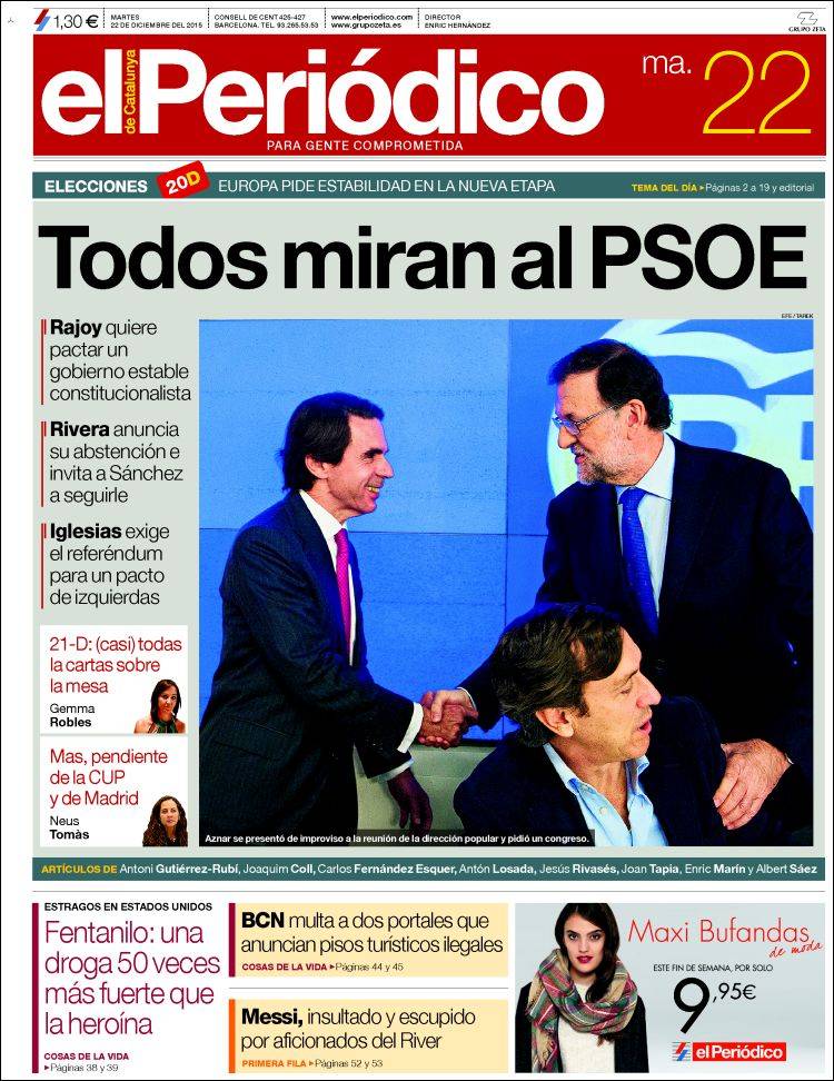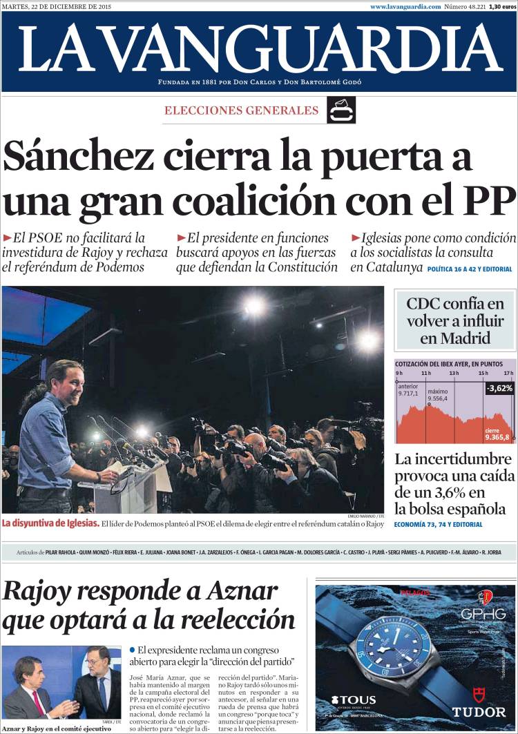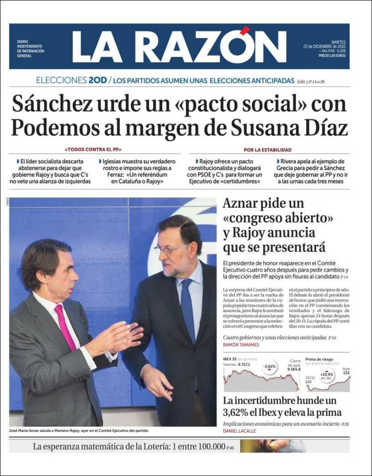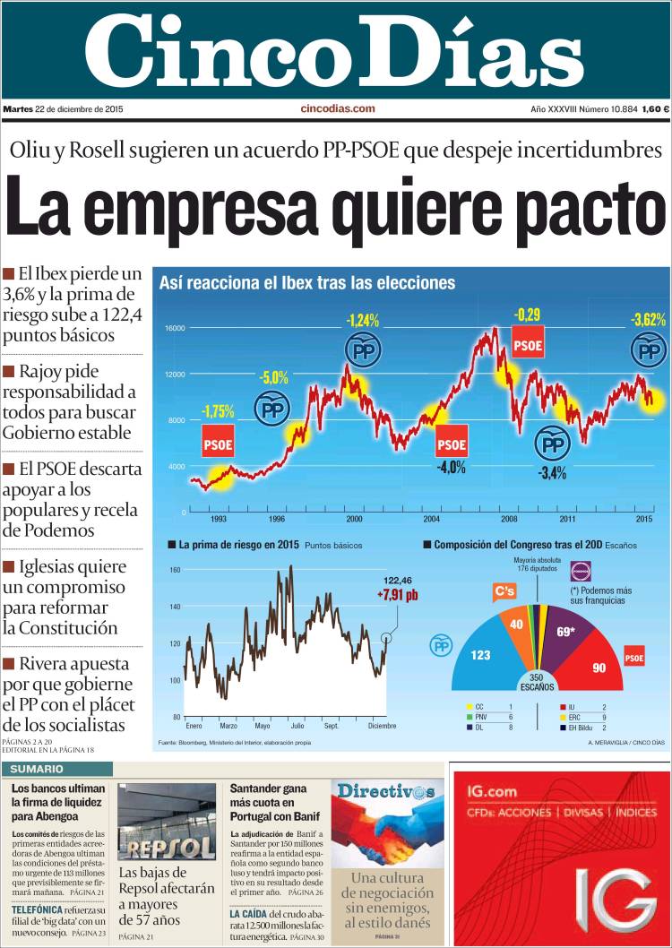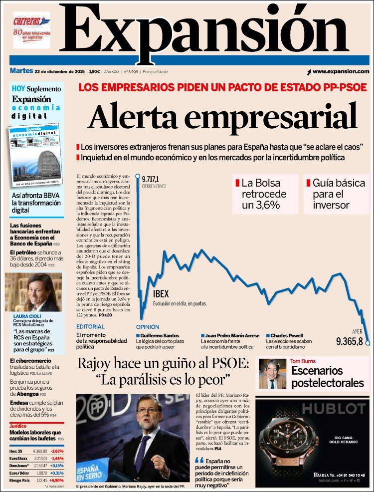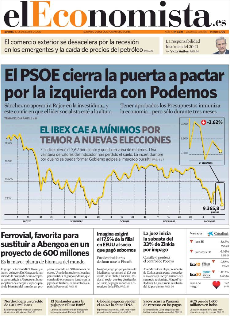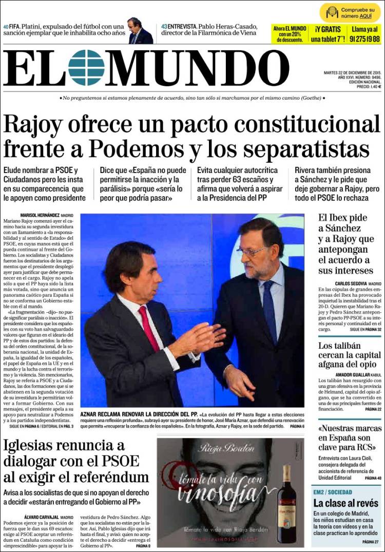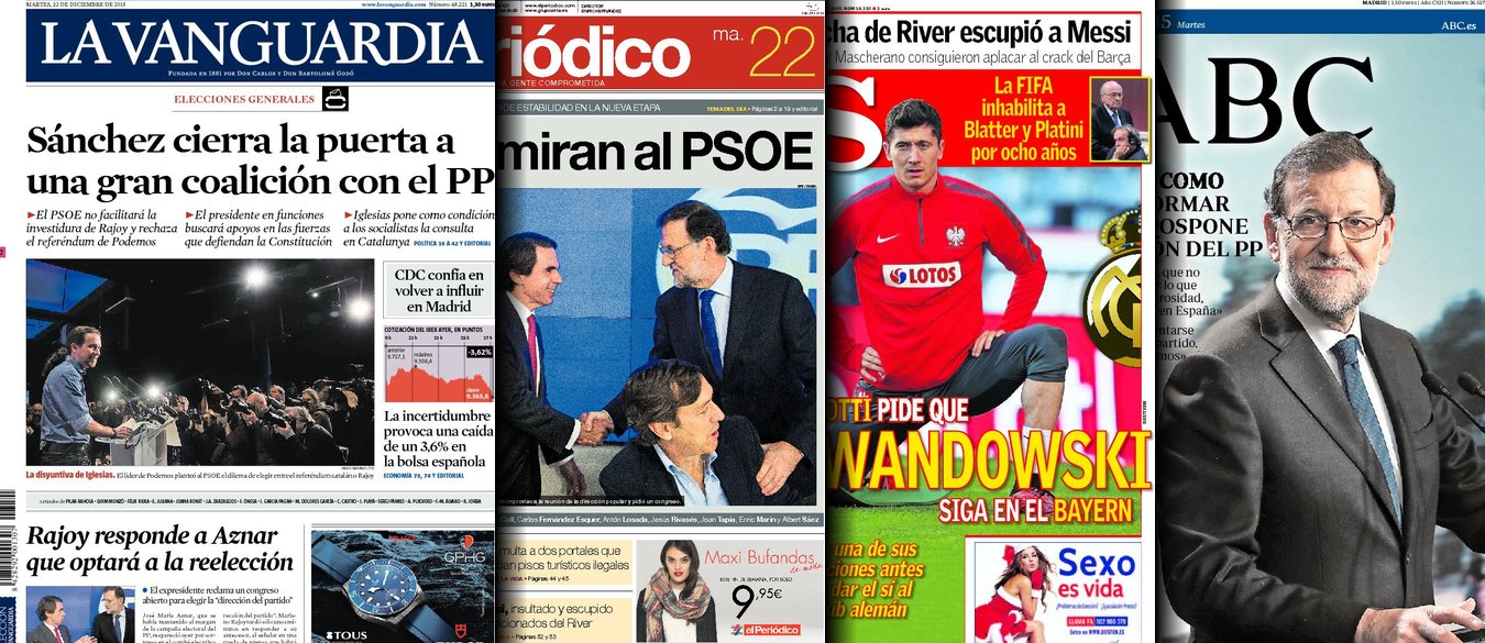 Portadas de los diarios El Mundo, El País, ABC, La Razón, La Vanguardia, El Periódico, Cinco Días, El Economista, Expansión, As, Mundo Deportivo y Sport.