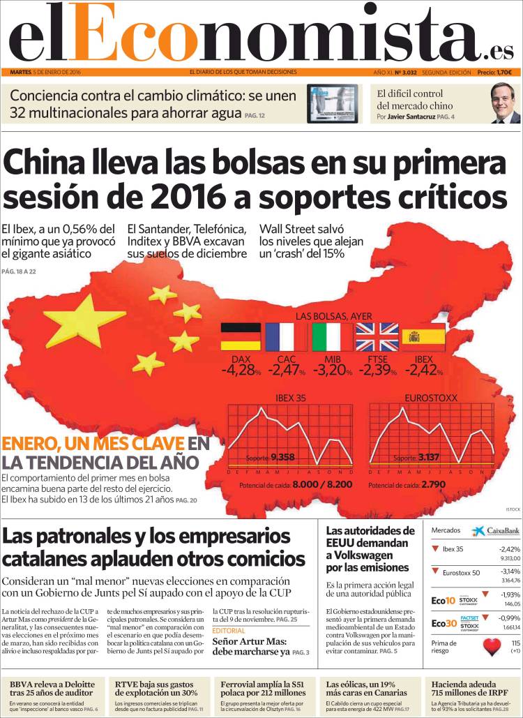 "China lleva las bolsas en su primera sesión de 2016 a soportes críticos"