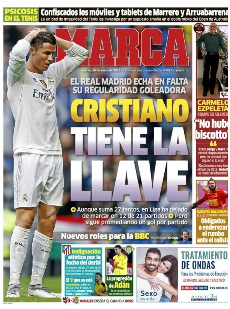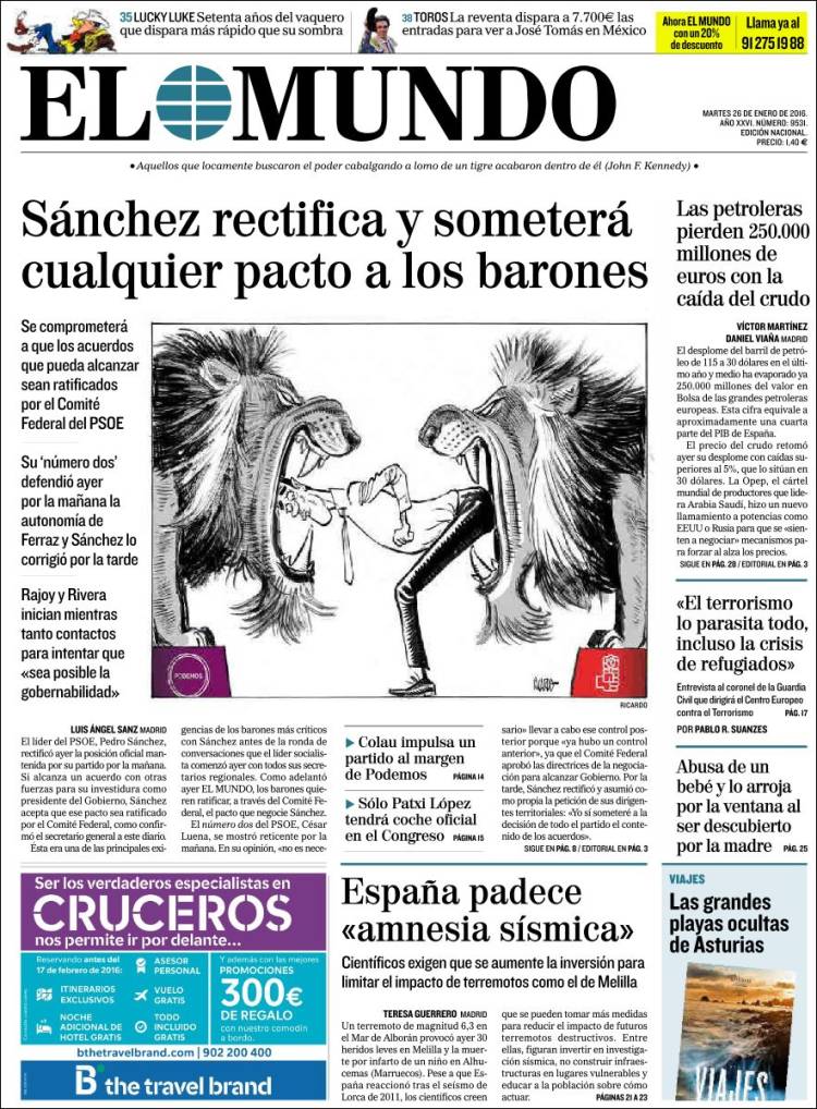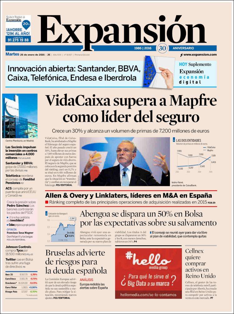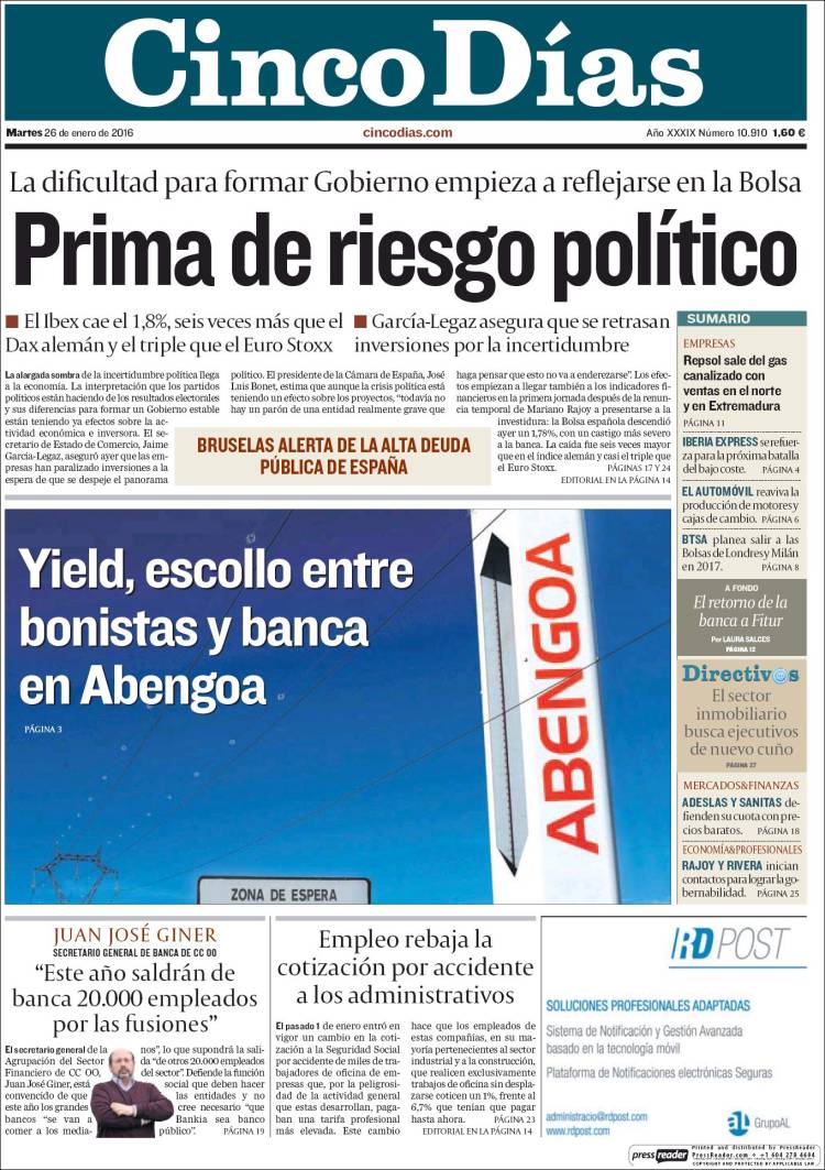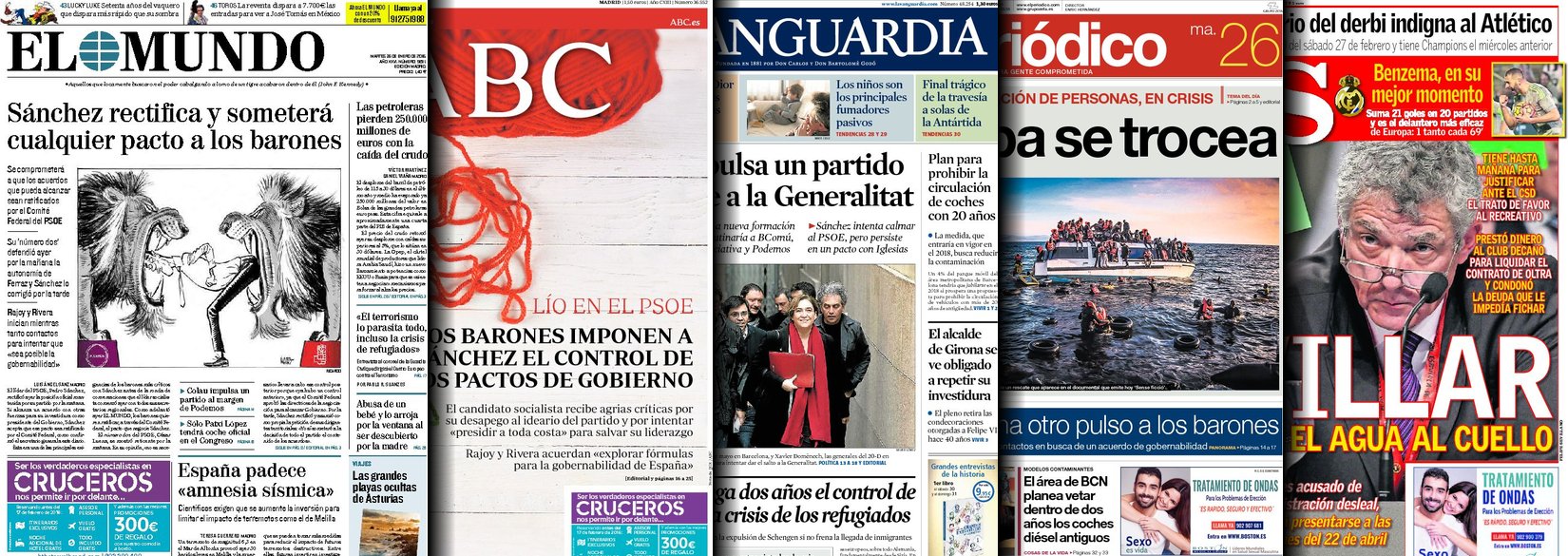 Portadas de los diarios El Mundo, El País, ABC, La Razón, La Vanguardia, El Periódico, Cinco Días, El Economista, Expansión, Marca, As, Mundo Deportivo y Sport.Portadas de los diarios ABC, As, El Periódico y La Vanguardia.