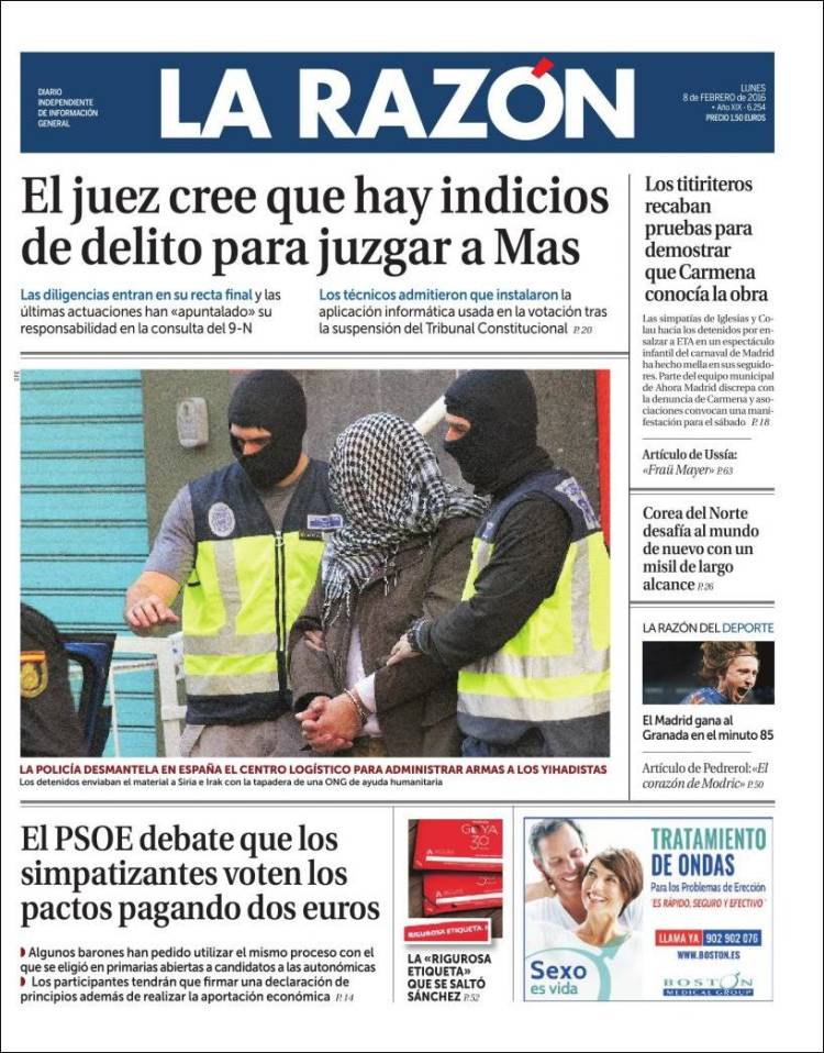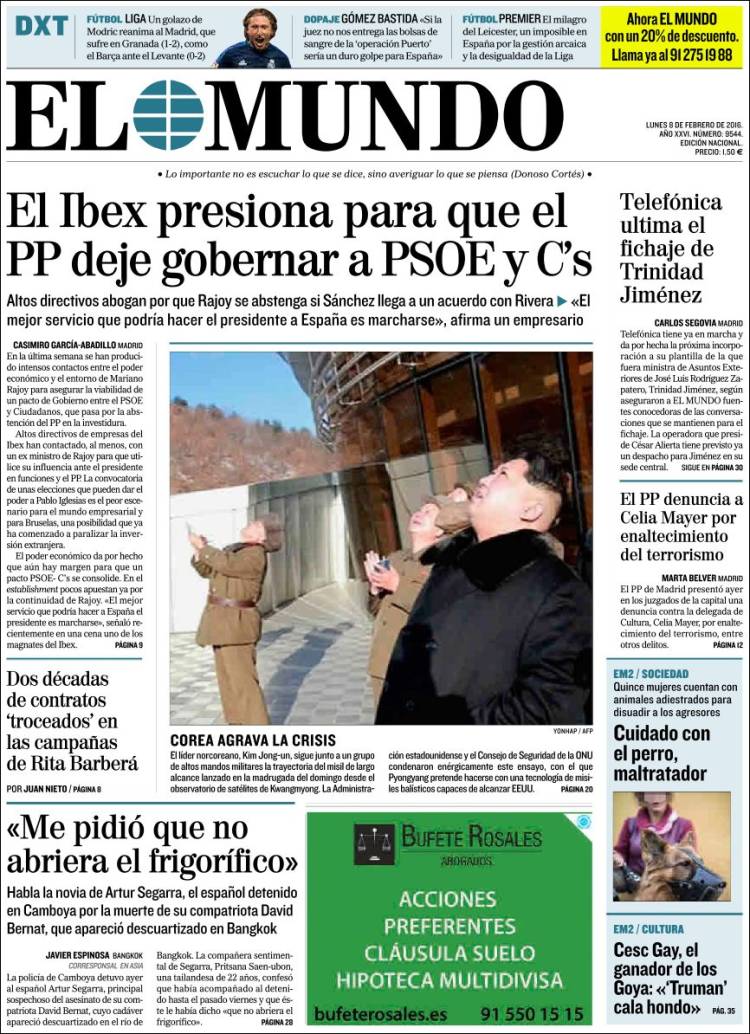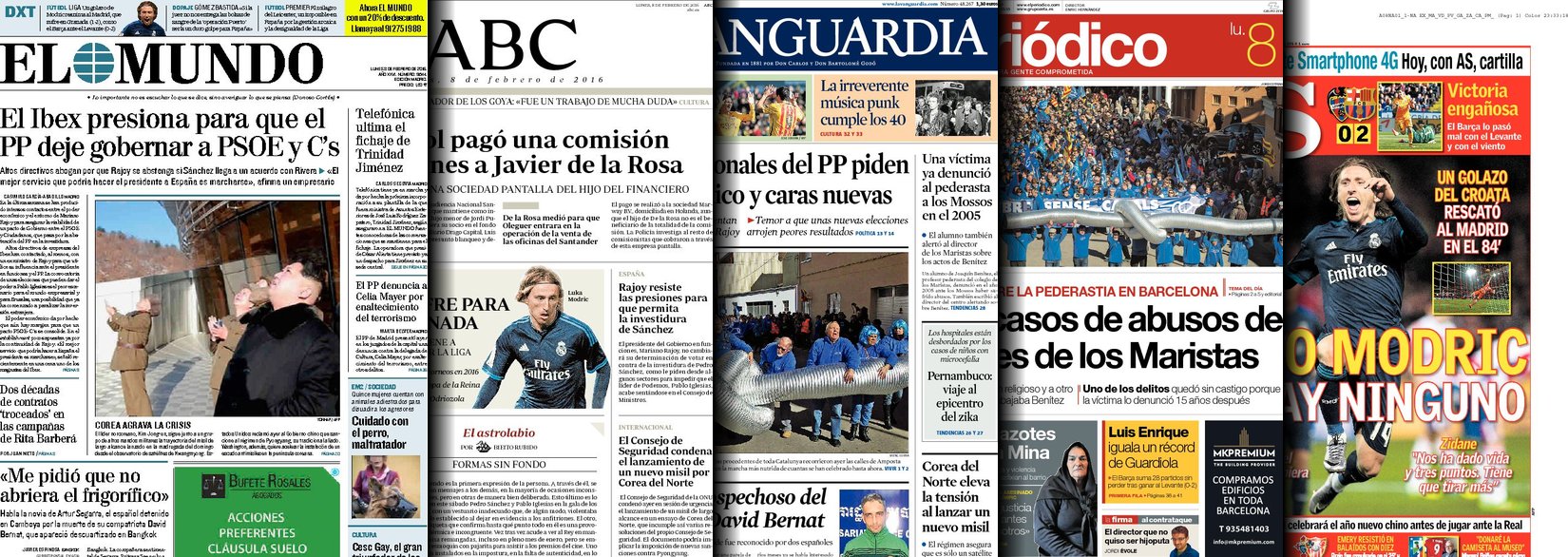 Portadas de los diarios El Mundo, El País, ABC, La Razón, La Vanguardia, El Periódico, Cinco Días, El Economista, Expansión, Marca, As, Mundo Deportivo y Sport.