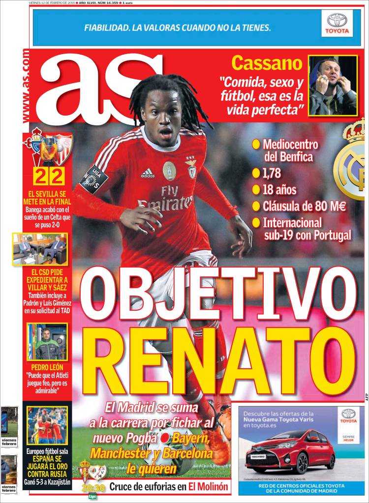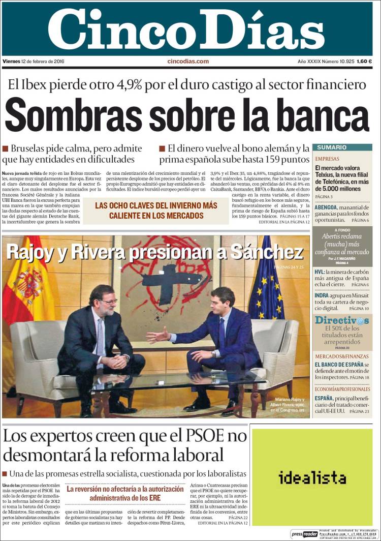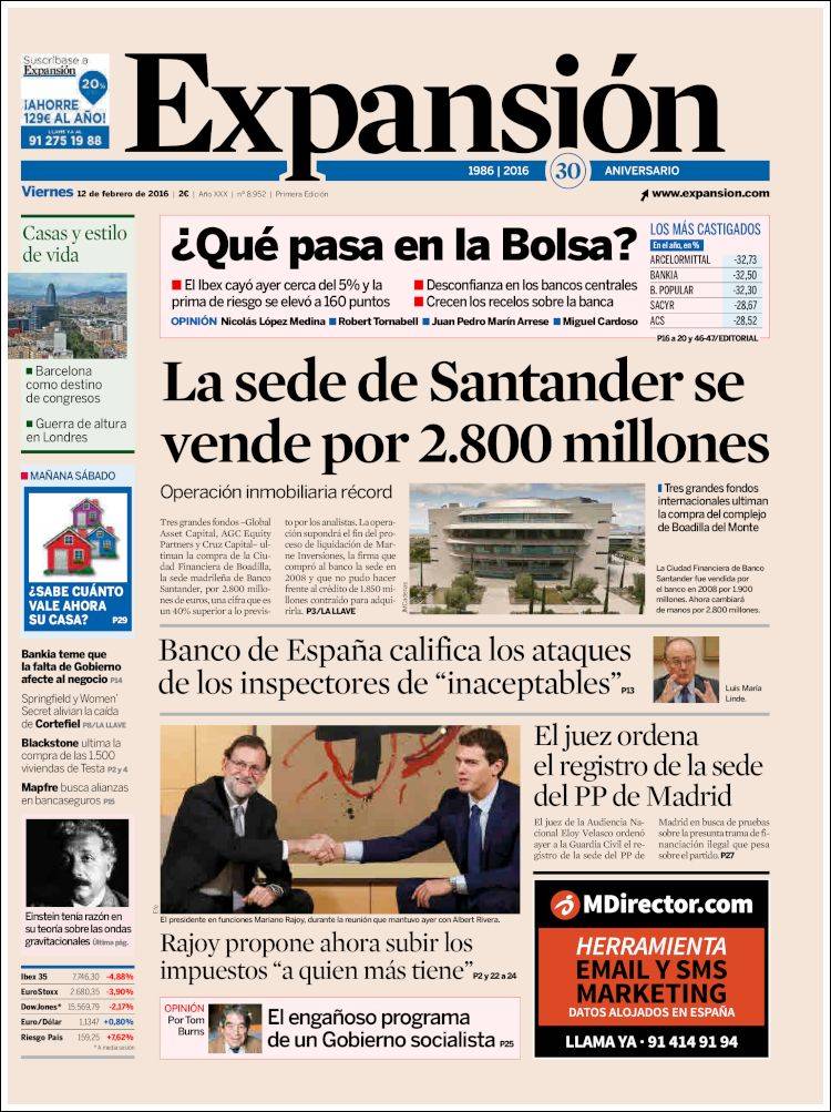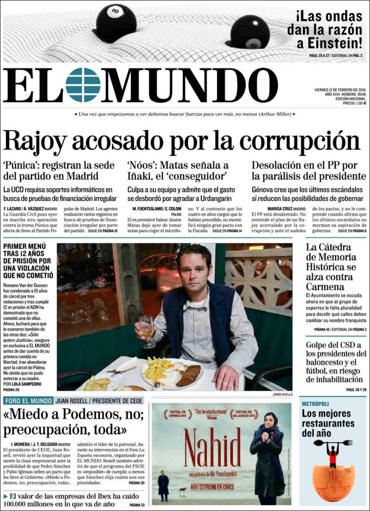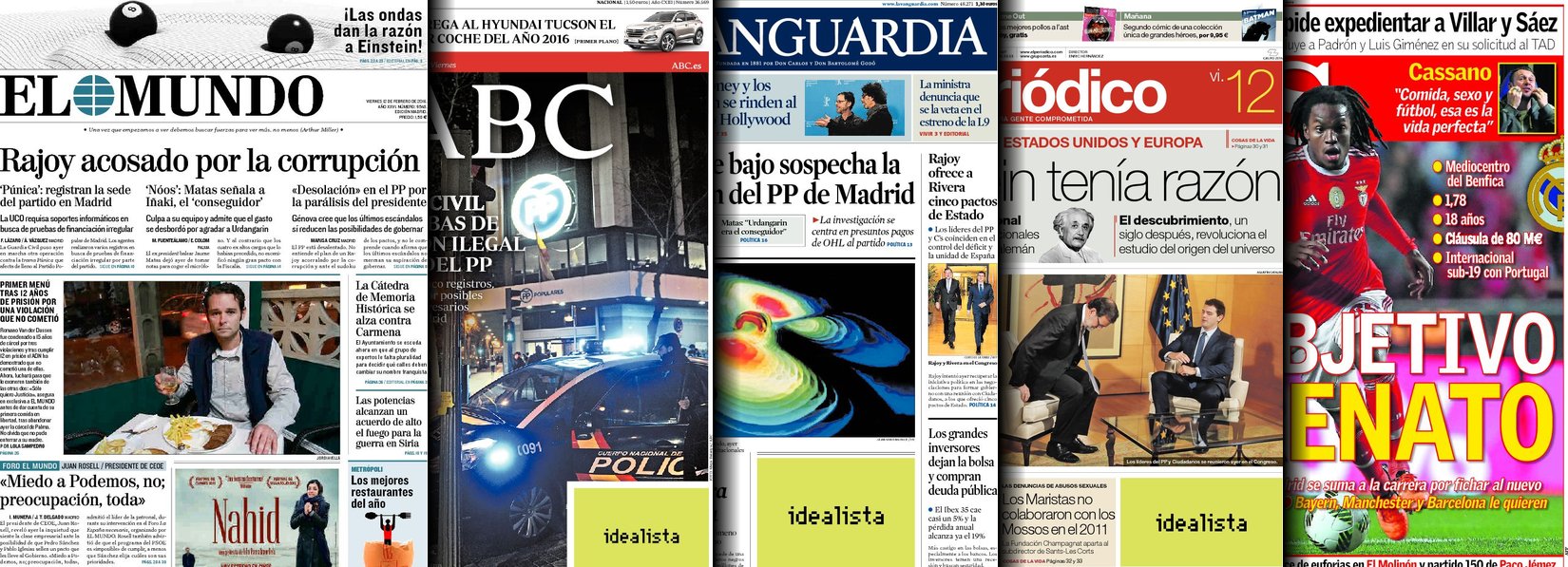 Portadas de los diarios El Mundo, El País, ABC, La Razón, La Vanguardia, El Periódico, Cinco Días, El Economista, Expansión, Marca, As, Mundo Deportivo y Sport.
