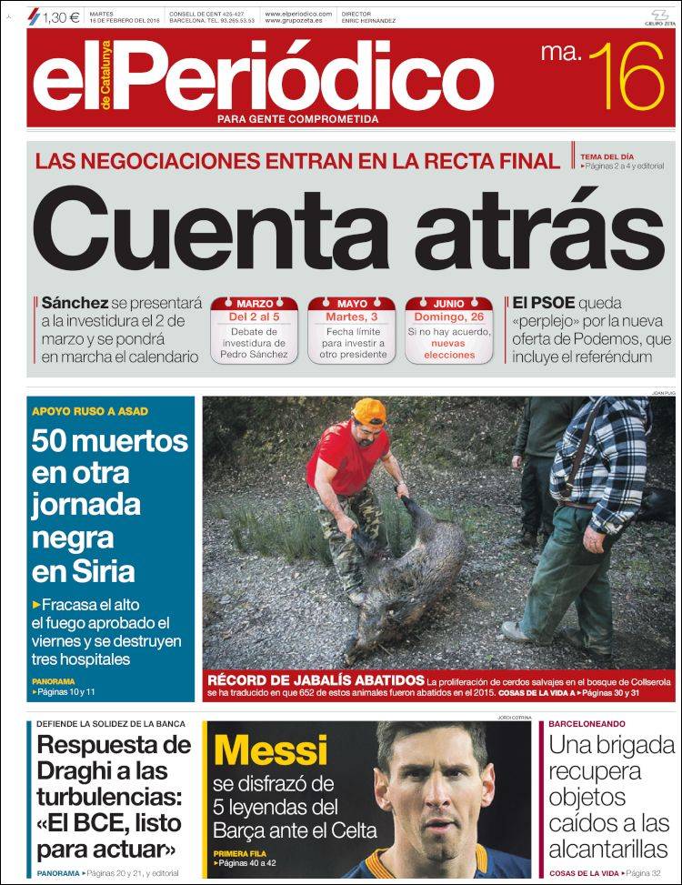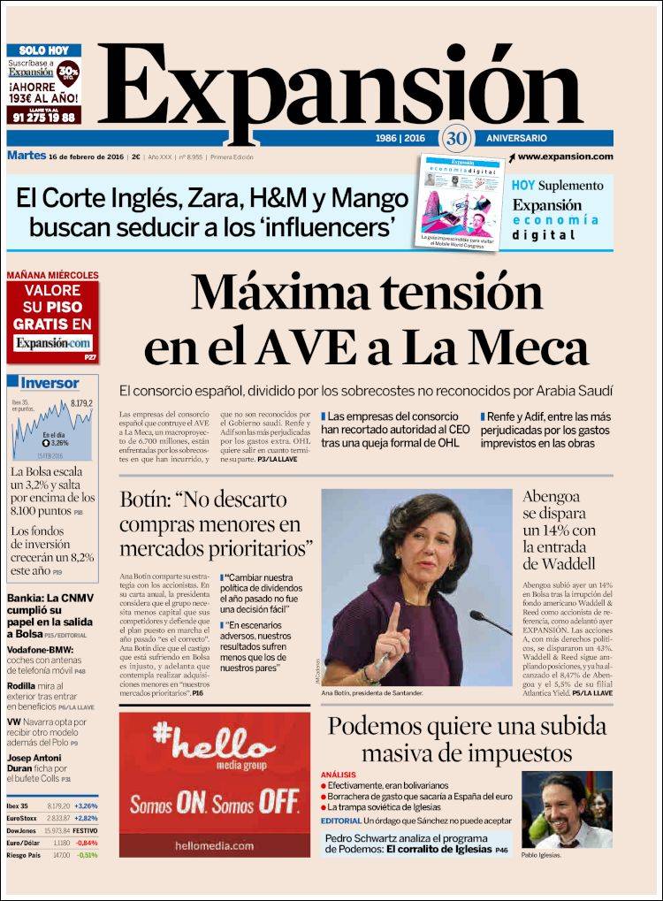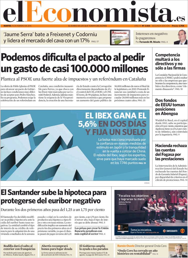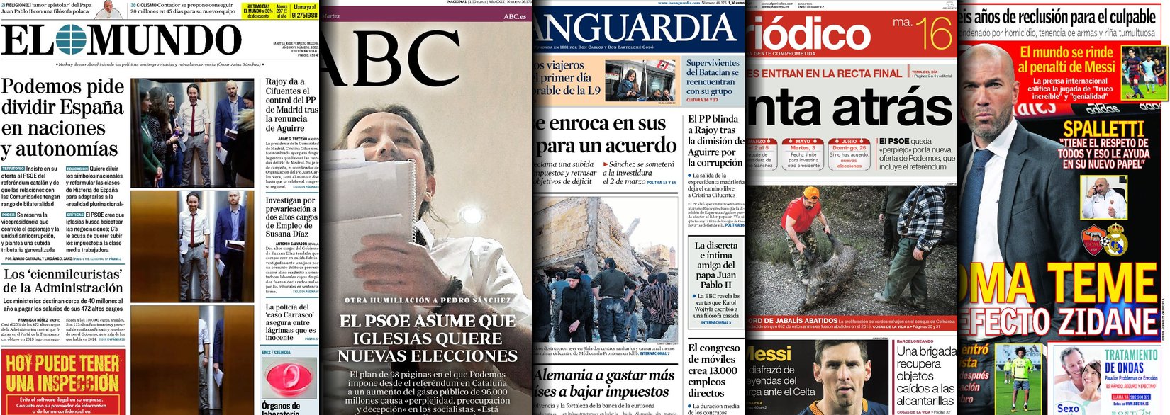 Portadas de los diarios El Mundo, El País, ABC, La Razón, La Vanguardia, El Periódico, Cinco Días, El Economista, Expansión, Marca, As, Mundo Deportivo y Sport.