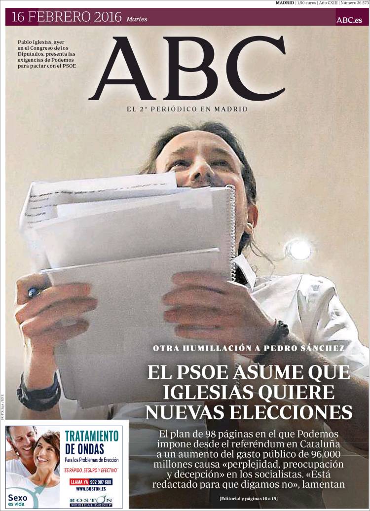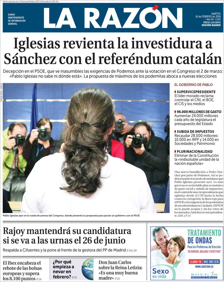 "Iglesias revienta la investidura de Sánchez con el referéndum catalán"